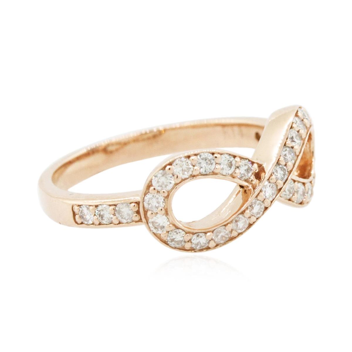 One electronically tested 14KT rose gold ladies cast diamond ring with a bright polish finish. Identified with markings of "K14". Condition is new. Containing: Thirty prong set round brilliant cut diamonds, measuring 1.50 - 1.50 x 0.90mm (depth est.) approximate total weight of 30 Stones = 0.37ct. Clarity: SI-2 to I-1. Color: I - J, Cut is Good. All diamonds are graded in the mounting, unless otherwise stated. Total Weight of Diamonds 0.37ct. Total Weight of Ring 3.40 grams. GGL Appraised at $2,050.00.