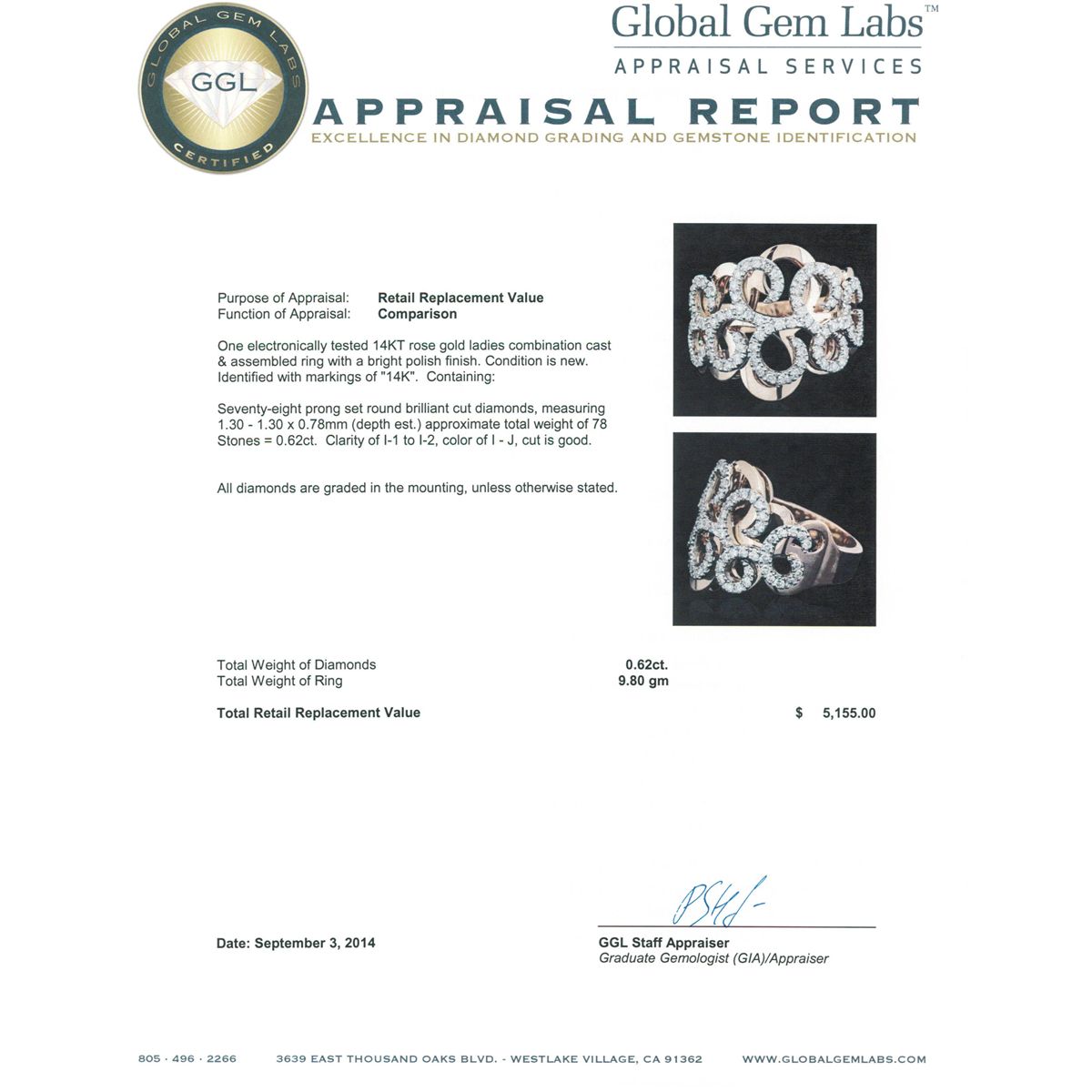 One electronically tested 14KT rose gold ladies combination cast & assembled ring with a bright polish finish. Identified with markings of "14K". Condition is new. Containing: Seventy-Eight prong set round brilliant cut diamonds, measuring 1.30 - 1.30 x 0.78mm (depth est.) approximate total weight of 78 Stones = 0.62ct. Clarity: I-1 to I-2. Color: I - J, Cut is Good. All diamonds are graded in the mounting, unless otherwise stated. Total Weight of Diamonds 0.62ct. Total Weight of Ring 9.80 grams. GGL Appraised at $5,155.00.