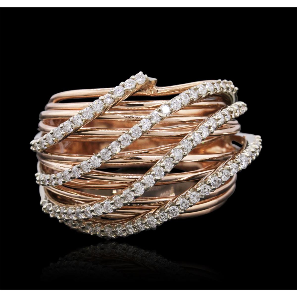One electronically tested 14KT rose gold ladies cast diamond ring. The ring features several rose gold curvatures supported by diagonally set diamond ribbons, completed by a six and one-half millimeter wide band. Bright polish finish with rhodium accents. Identified with markings of 14K. Condition is new, good workmanship. Containing: Seventy-Seven prong set round brilliant cut diamonds, measuring 1.30 - 1.20 x 0.75mm (depth est.) approximate total weight of 77 Stones = 0.64ct. Graded in the setting. Clarity: SI-1 to I-1. Color: G - I. Total Weight of Diamonds 0.64ct. Total Weight of Ring 10.56 grams. AIG Appraised at $4,230.00.