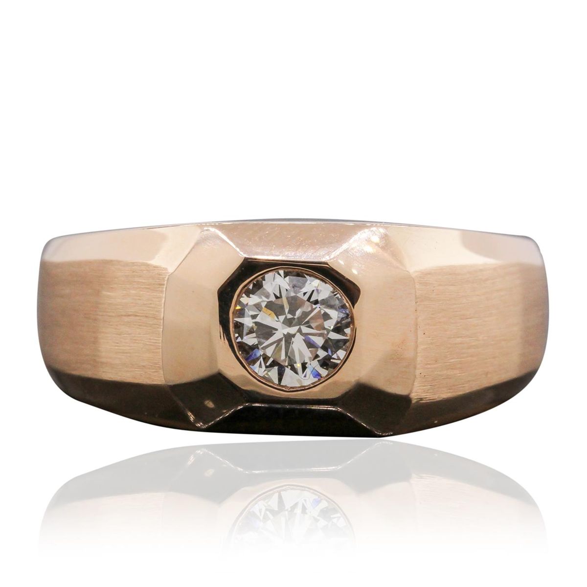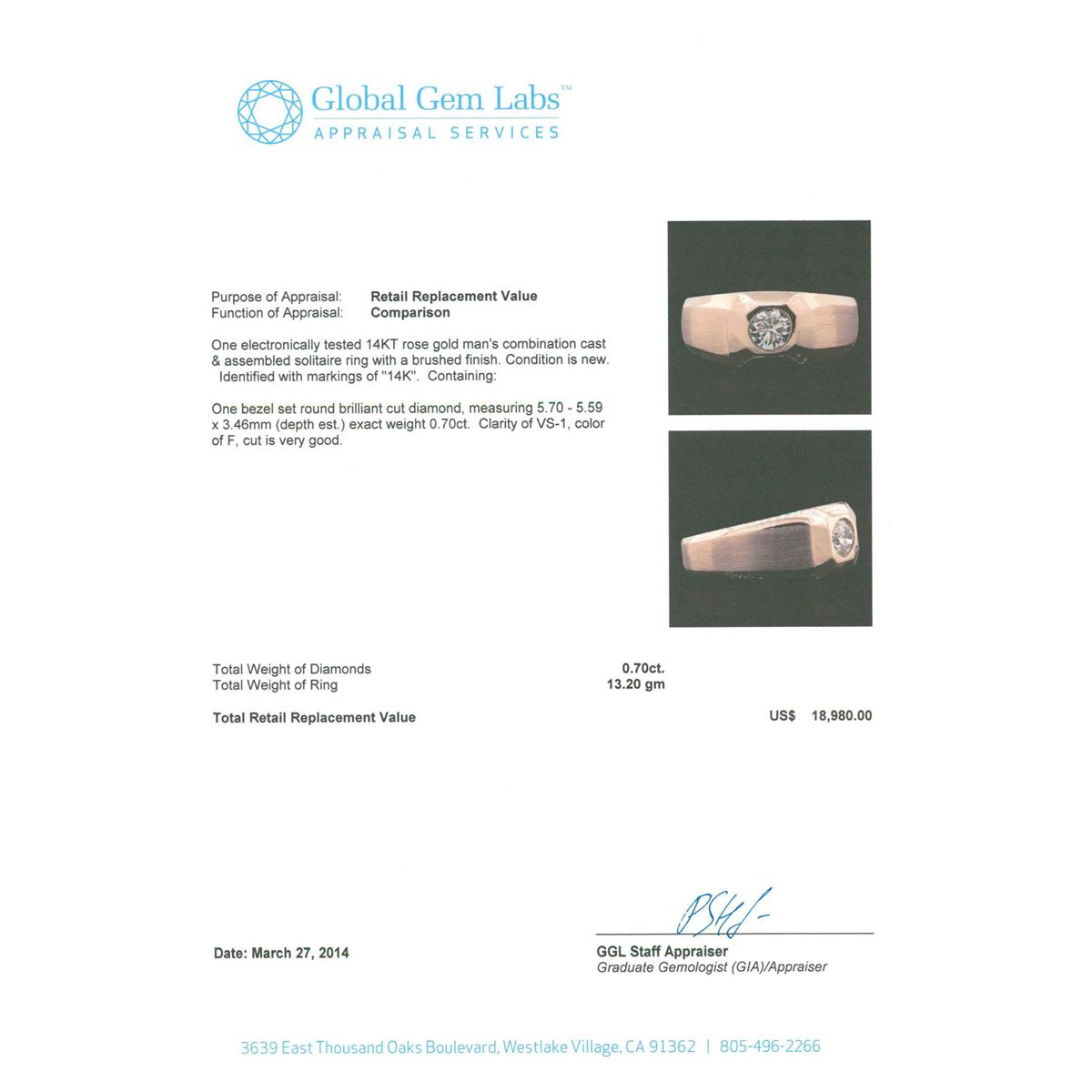 One electronically tested 14KT rose gold man's combination cast & assembled solitaire ring with a brushed finish. Condition is new. Identified with markings of "14K". Containing: One bezel set round brilliant cut diamond, measuring 5.70 - 5.59 x 3.46mm (depth est.) exact weight 0.70ct. Clarity: VS-1. Color: F, Cut is Very Good. Total Weight of Diamonds 0.70ct. Total Weight of Ring 13.20 grams. GGL Appraised at $18,980.00.