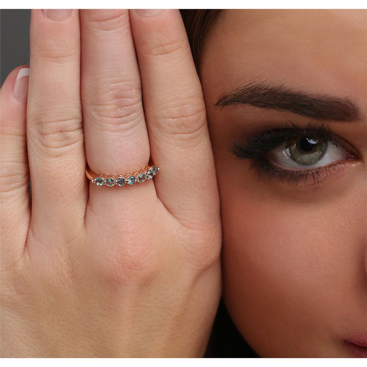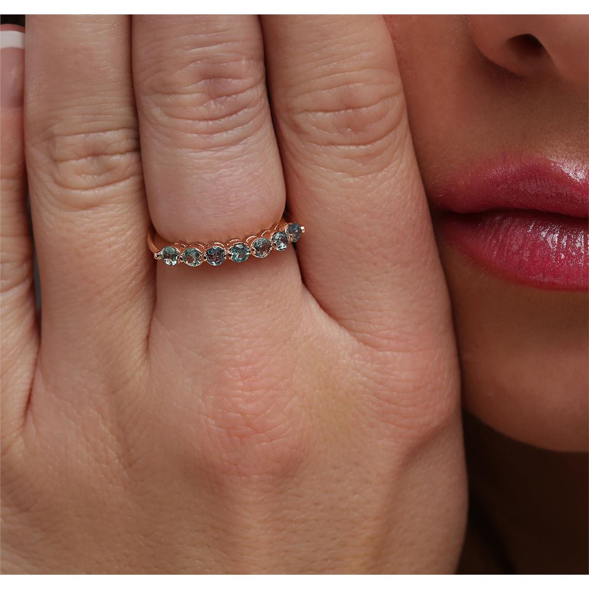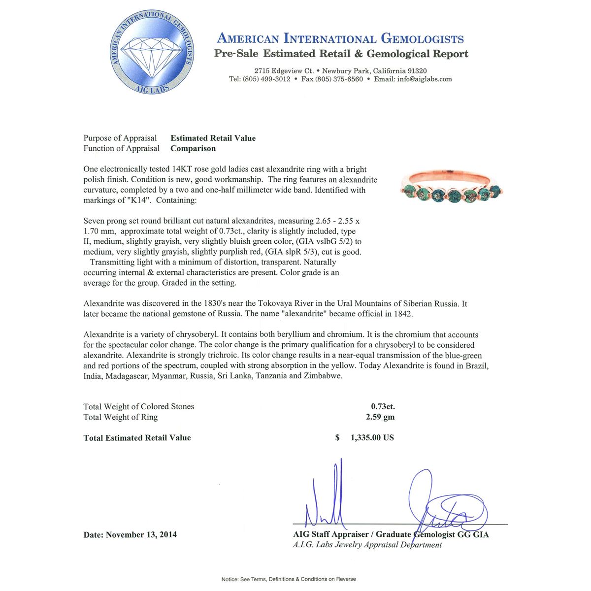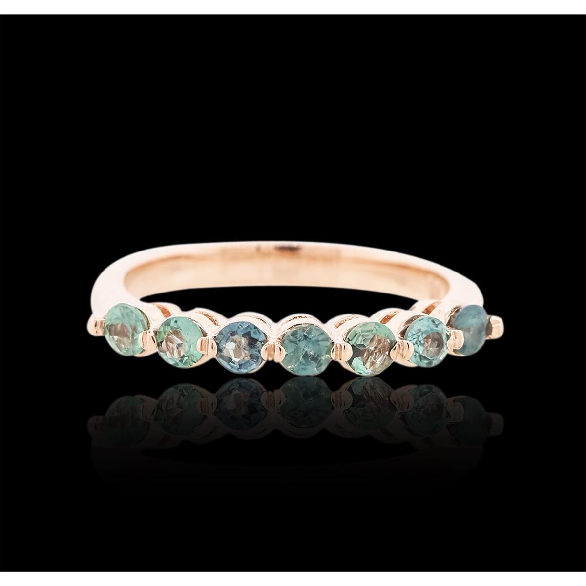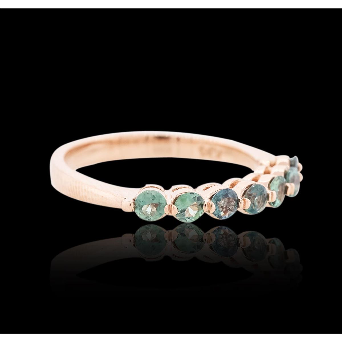 One electronically tested 14KT rose gold ladies cast alexandrite ring with a bright polish finish. The ring features an alexandrite curvature, completed by a two and one-half millimeter wide band. Identified with markings of "K14". Condition is new, good workmanship. Containing: Seven prong set round brilliant cut natural alexandrites, measuring 2.65 - 2.55 x 1.70 mm, approximate total weight of 0.73ct., clarity is slightly included, type II, medium, slightly grayish, very slightly bluish green color, (GIA vslbG 5/2) to medium, very slightly grayish, slightly purplish red, (GIA slpR 5/3), cut is good. Transmitting light with a minimum of distortion, transparent. Naturally occurring internal & external characteristics are present. Color grade is an average for the group. Graded in the setting. Alexandrite was discovered in the 1830's near the Tokovaya River in the Ural Mountains of Siberian Russia. It later became the national gemstone of Russia. The name "alexandrite" became official in 1842.Alexandrite is a variety of chrysoberyl. It contains both beryllium and chromium. It is the chromium that accounts for the spectacular color change. The color change is the primary qualification for a chrysoberyl to be considered alexandrite. Alexandrite is strongly trichroic. Its color change results in a near-equal transmission of the blue-green and red portions of the spectrum, coupled with strong absorption in the yellow. Today Alexandrite is found in Brazil, India, Madagascar, Myanmar, Russia, Sri Lanka, Tanzania and Zimbabwe. Total Weight of Colored Stones 0.73ct. Total Weight of Ring 2.59 grams. AIG Appraised at $1,335.00.