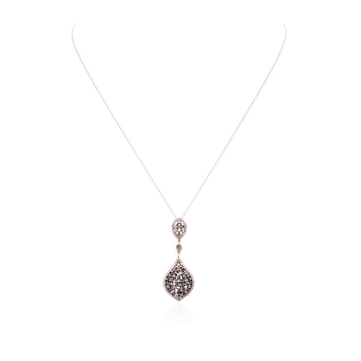 One electronically tested 14KT rose gold ladies combination cast & assembled diamond pendant & chain 18.0" long, cable link with a spring ring clasp with a bright polish finish. Identified with markings of "585". Condition is new. Containing: Forty-Five prong set round brilliant cut diamonds, measuring 1.80 - 1.10 x 0.87mm (depth est.) approximate total weight of 45 Stones = 0.50ct. Clarity: SI-1 to SI-2, Cut is Good. Seventy-Two prong set round brilliant cut diamonds, measuring 1.00 - 1.00 x 0.60mm (depth est.) approximate total weight of 72 Stones = 0.26ct. Clarity: I-1 to I-2. Color: I - J, Cut is Good. All diamonds are graded in the mounting, unless otherwise stated. Total Weight of Diamonds 0.76ct. Total Weight of Pendant & Chain 3.90 grams. GGL Appraised at $3,705.00.