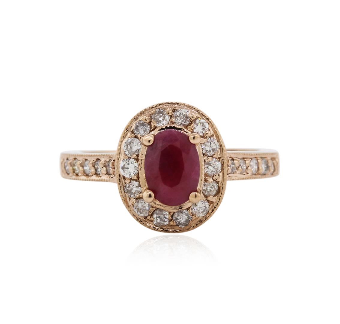 One ring featuring: 14KT rose gold weighing 5.00 grams containing one ruby center stone with a total weight of 0.78ct and 24 diamonds with a total weight of 0.43ct.