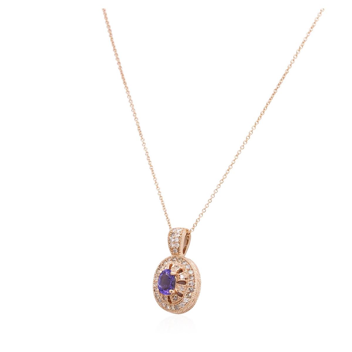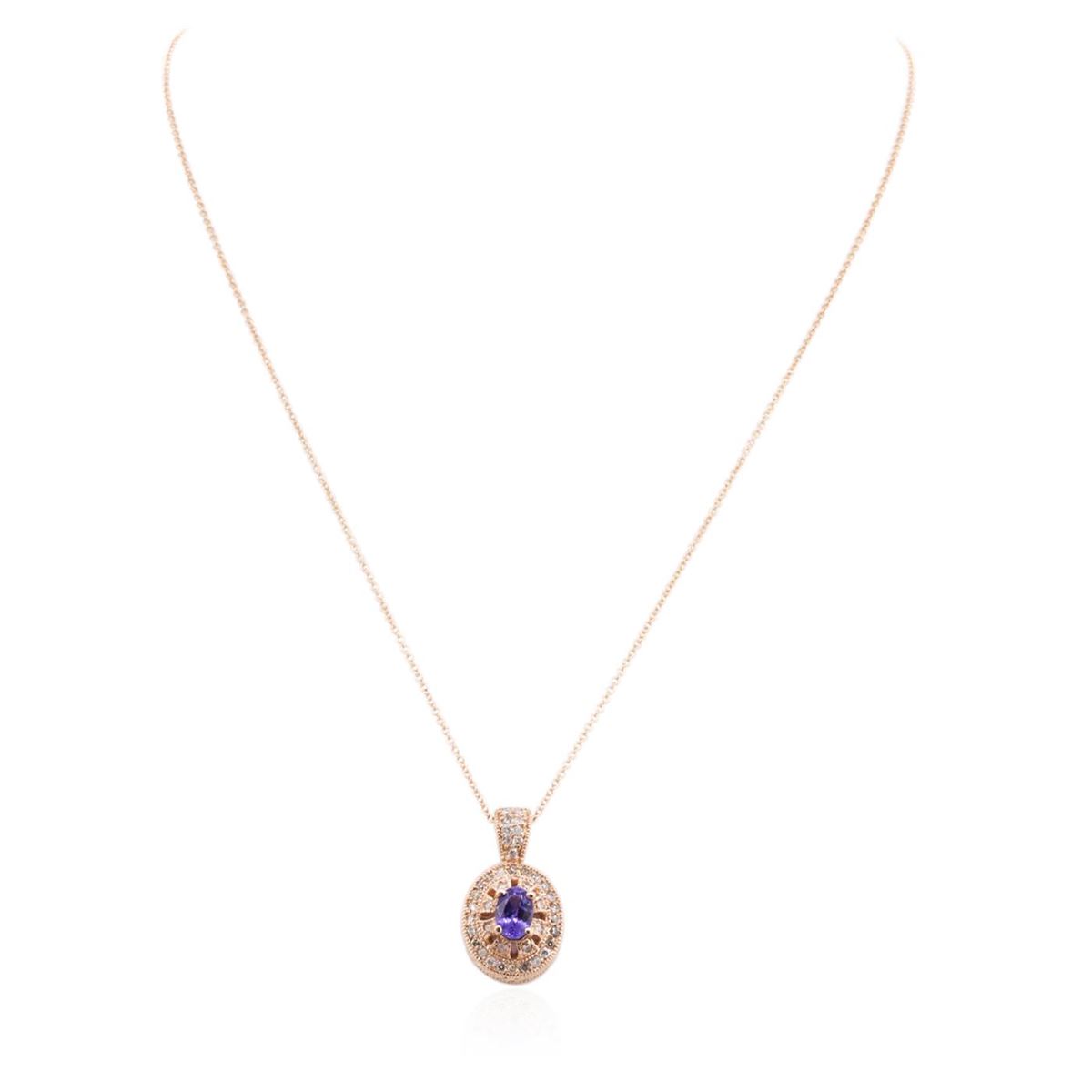 One pendant with chain featuring: 14KT rose gold weighing 4.67 grams containing one sapphire with a total weight of 0.80ct and round diamonds with a total weight of 0.53cts.