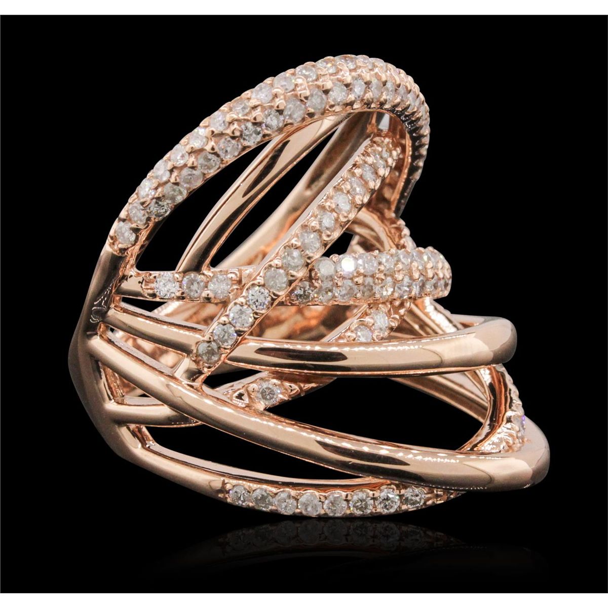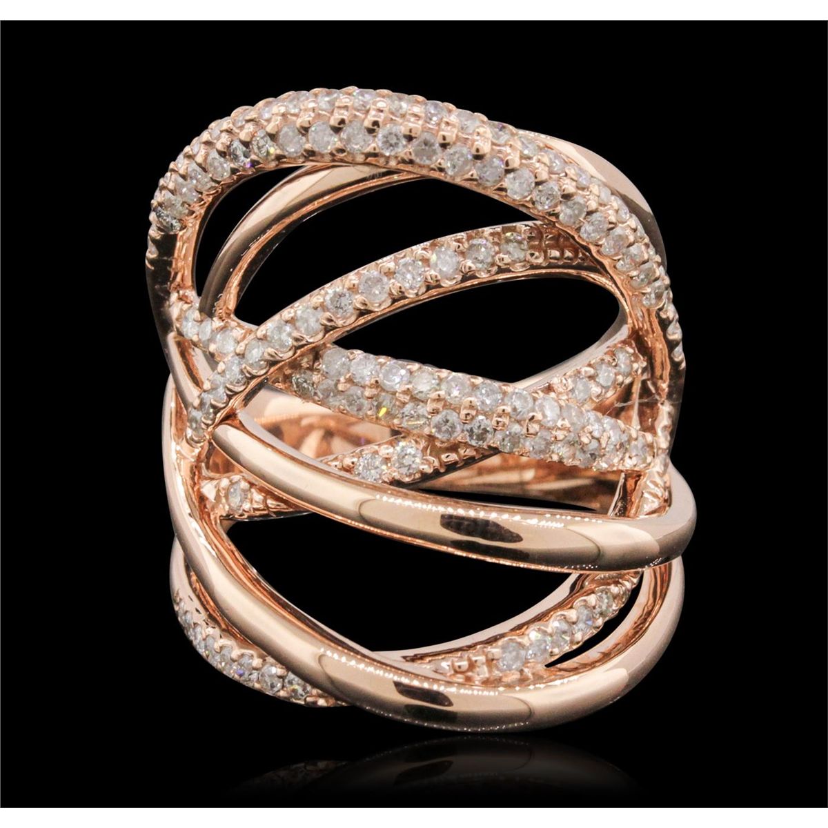 One electronically tested 14KT rose gold ladies combination cast & assembled ring with a bright polish finish. Condition is new. Identified with markings of "585". Containing: One Hundred Fourteen prong set round brilliant cut diamonds, measuring 1.30 - 1.30 x 0.78mm (depth est.) approximate. Total Weight of 114 Stones = 0.91ct. Clarity: I-1 to I-2. Color: I - J, Cut is Good. All diamonds are graded in the mounting, unless otherwise stated. Total Weight of Diamonds 0.91ct. Total Weight of Ring 9.60 grams. GGL Appraised at $5,895.00.
