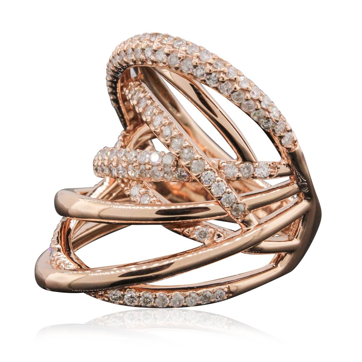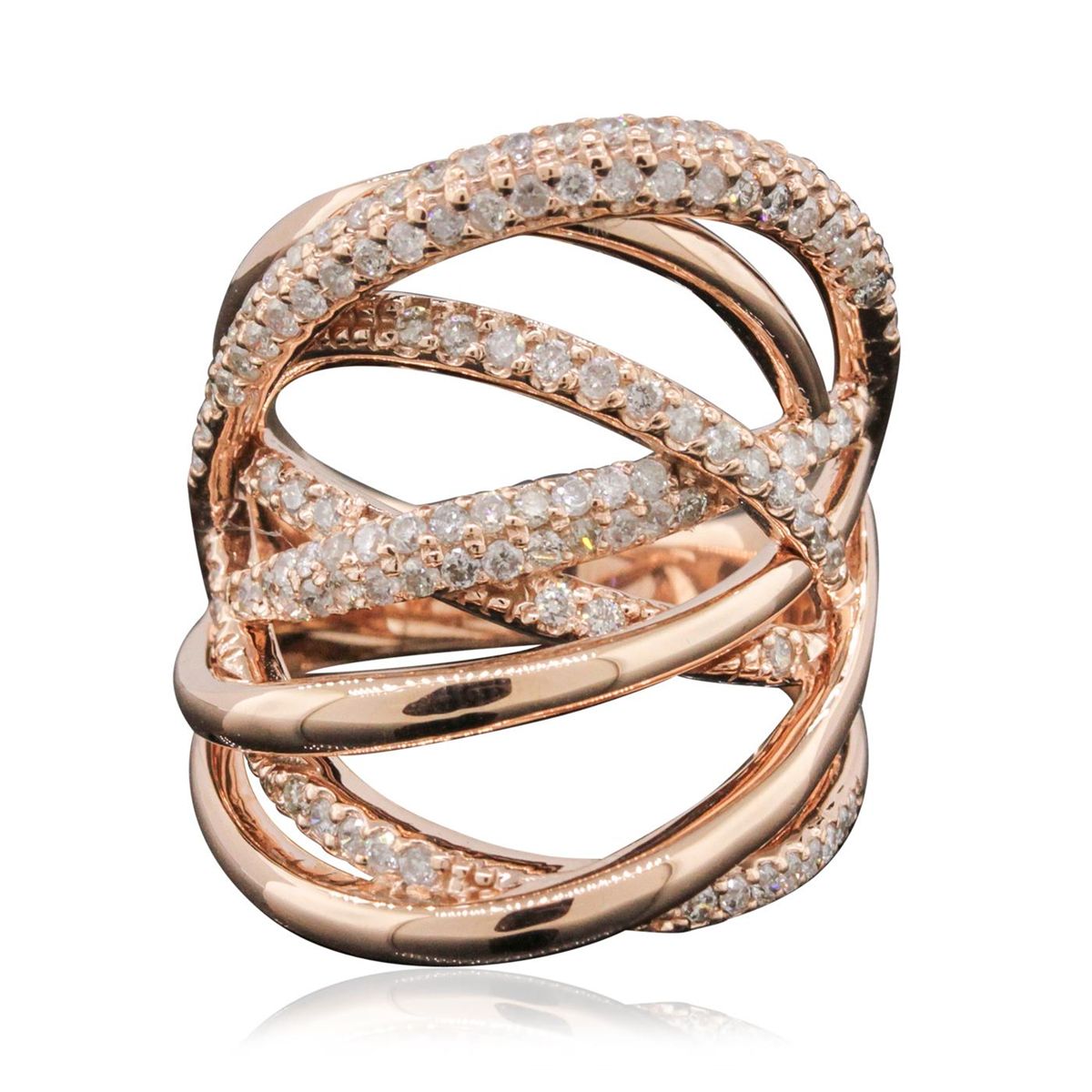 One electronically tested 14KT rose gold ladies combination cast & assembled ring with a bright polish finish. Condition is new. Identified with markings of "585". Containing: One Hundred Fourteen prong set round brilliant cut diamonds, measuring 1.30 - 1.30 x 0.78mm (depth est.) approximate. Total Weight of 114 Stones = 0.91ct. Clarity: I-1 to I-2. Color: I - J, Cut is Good. All diamonds are graded in the mounting, unless otherwise stated. Total Weight of Diamonds 0.91ct. Total Weight of Ring 9.60 grams. GGL Appraised at $5,895.00.
