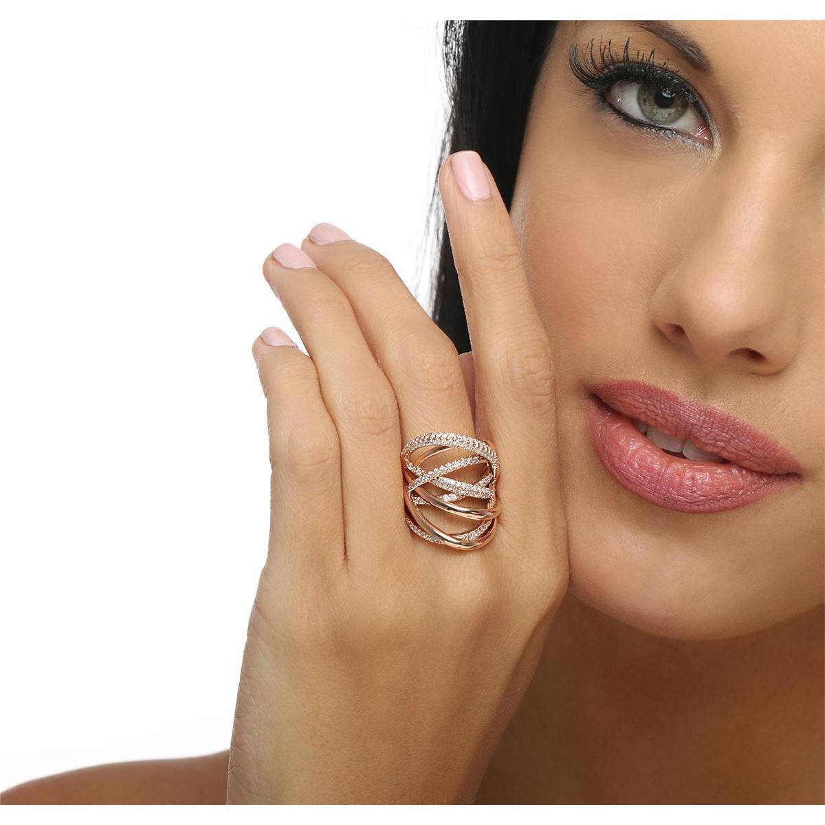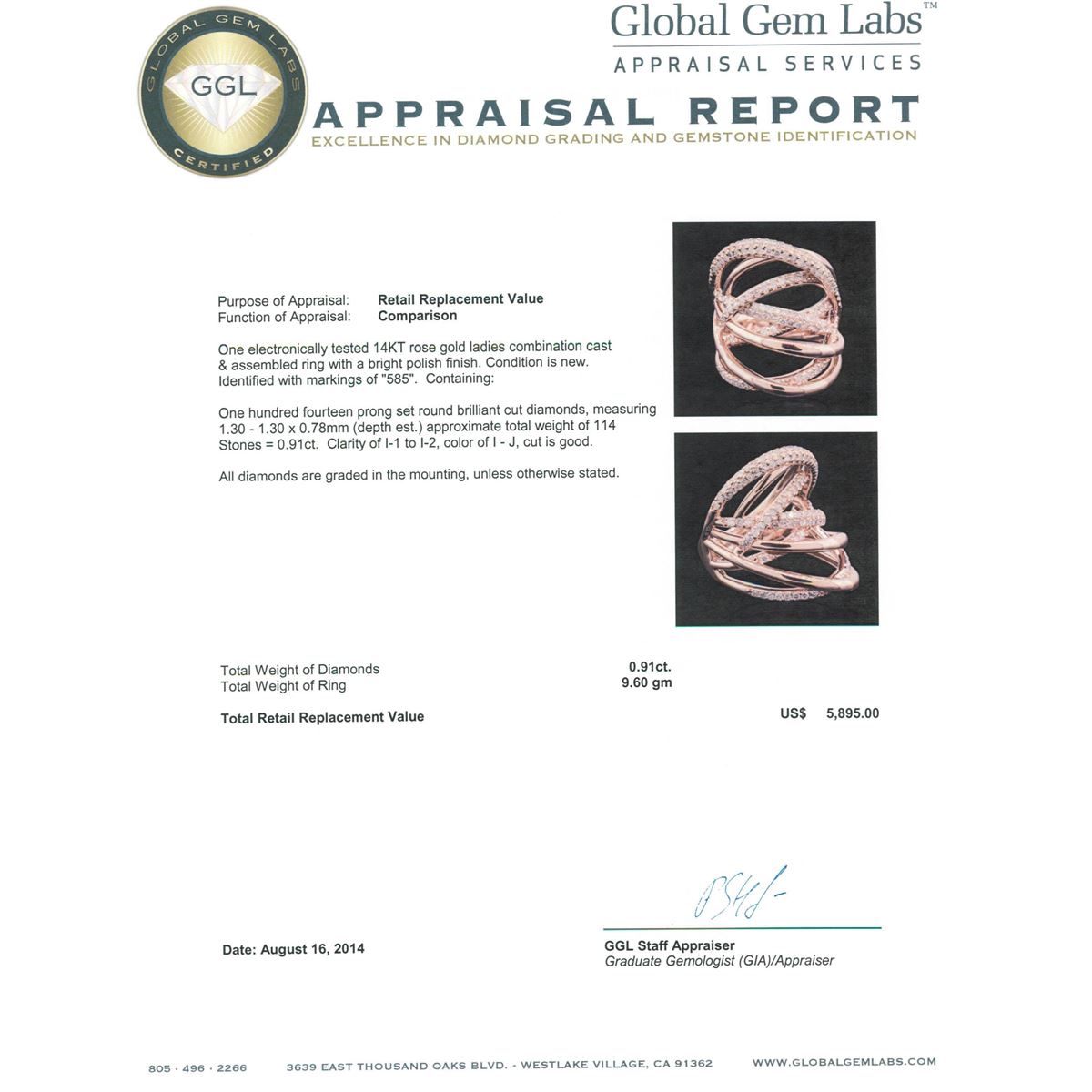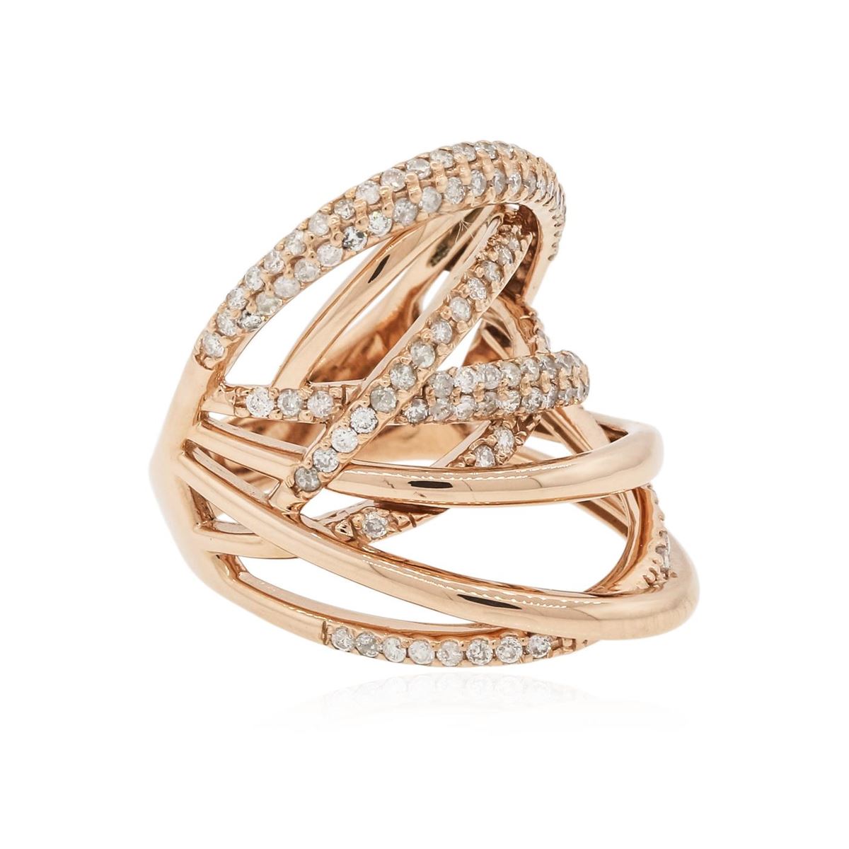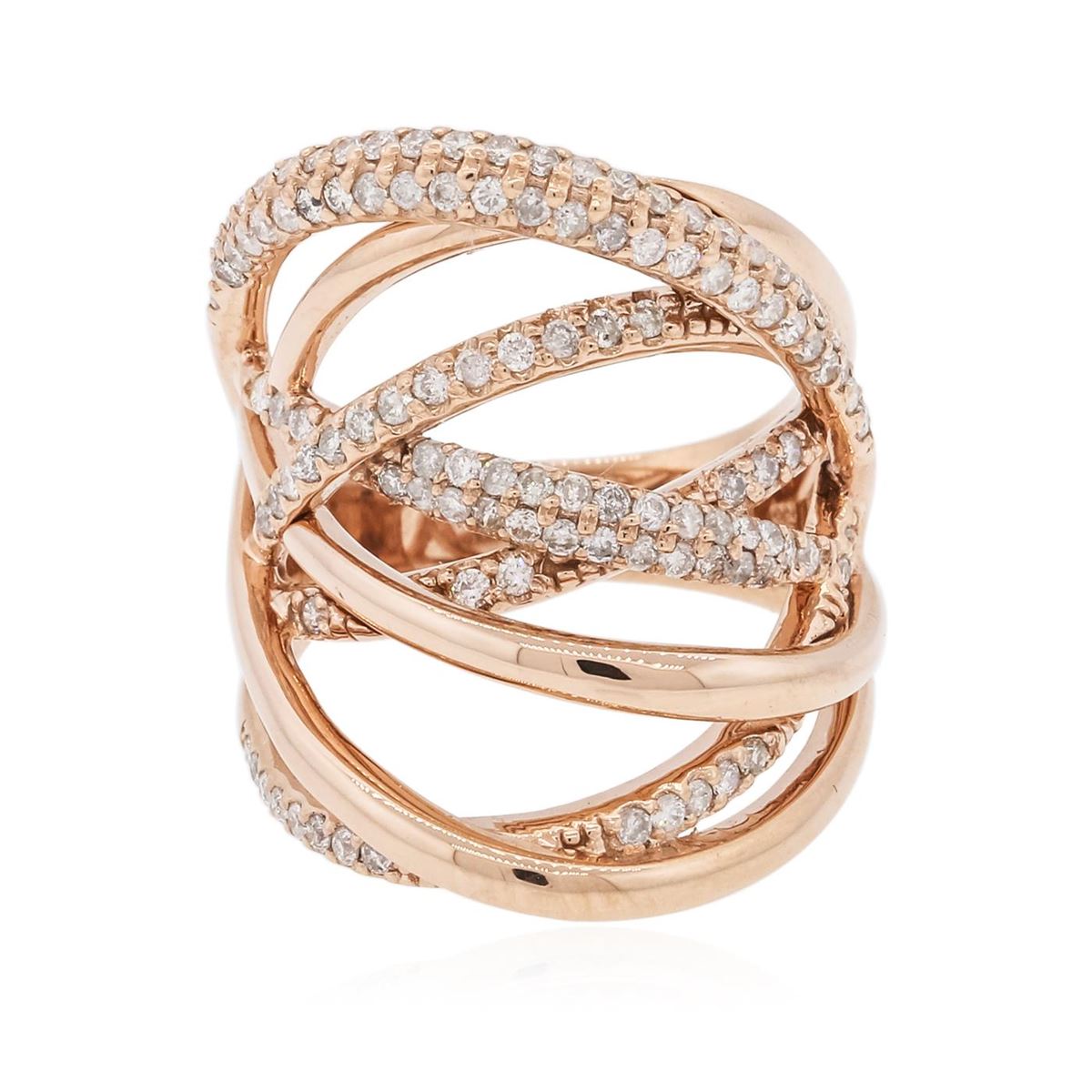 One electronically tested 14KT rose gold ladies combination cast & assembled ring with a bright polish finish. Condition is new. Identified with markings of "585". Containing: One Hundred Fourteen prong set round brilliant cut diamonds, measuring 1.30 - 1.30 x 0.78mm (depth est.) approximate. Total Weight of 114 Stones = 0.91ct. Clarity: I-1 to I-2. Color: I - J, Cut is Good. All diamonds are graded in the mounting, unless otherwise stated. Total Weight of Diamonds 0.91ct. Total Weight of Ring 9.60 grams. GGL Appraised at $5,895.00.