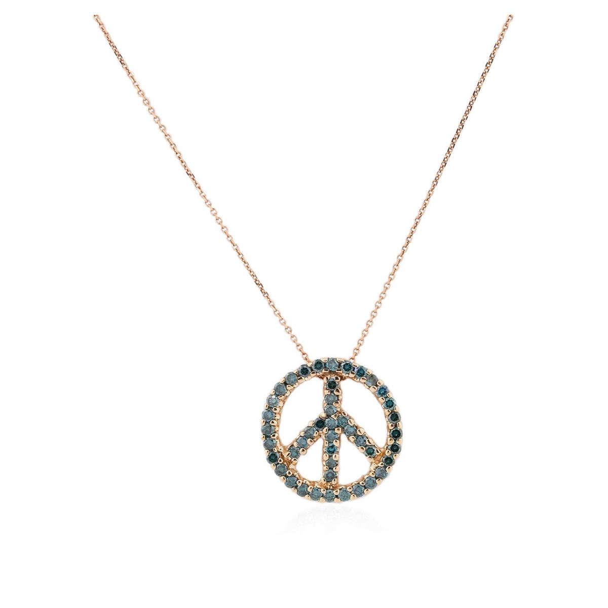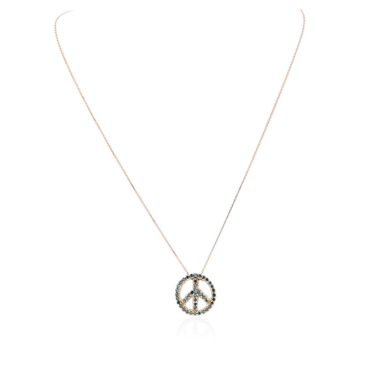 One peace pendant with chain featuring: 14KT rose gold weighing 2.30 grams containing prong set round blue diamonds with a total weight of 0.94ct.