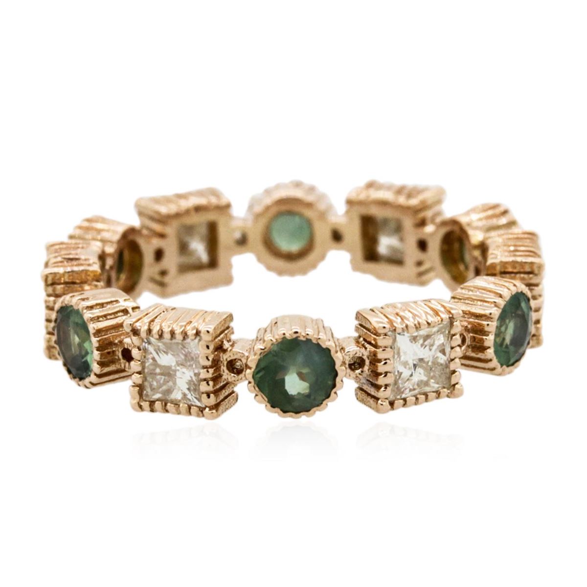 One electronically tested 14KT rose gold ladies cast green chrysoberyl and diamond ring. The ring features a continuous four millimeter wide green chrysoberyl and diamond ribbon. Bright polish finish with milgrain detailing. Condition is new, good workmanship. Containing: Six bezel set round brilliant cut natural green chrysoberyls, measuring 3.30 - 3.20 x 2.11 mm, approximate total weight of 1.02ct., clarity is slightly included, medium dark, very slightly grayish, very slightly bluish green color, (GIA vslbG 6/3), cut is good. Transmitting light with a minimum of distortion, transparent. Naturally occurring internal & external characteristics are present. Color grade is an average for the group. Graded in the setting. Six bezel set princess cut diamonds, measuring 3.30 x 3.10 x 2.00mm (depth est.) approximate total weight of 6 Stones = 1.10ct. Graded in the setting. Clarity: I-1 to I-2. Color: G - I. Total Weight of Colored Stones 1.02ct. Total Weight of Diamonds 1.10ct. Total Weight of Ring 2.96 grams. AIG Appraised at $2,540.00.
