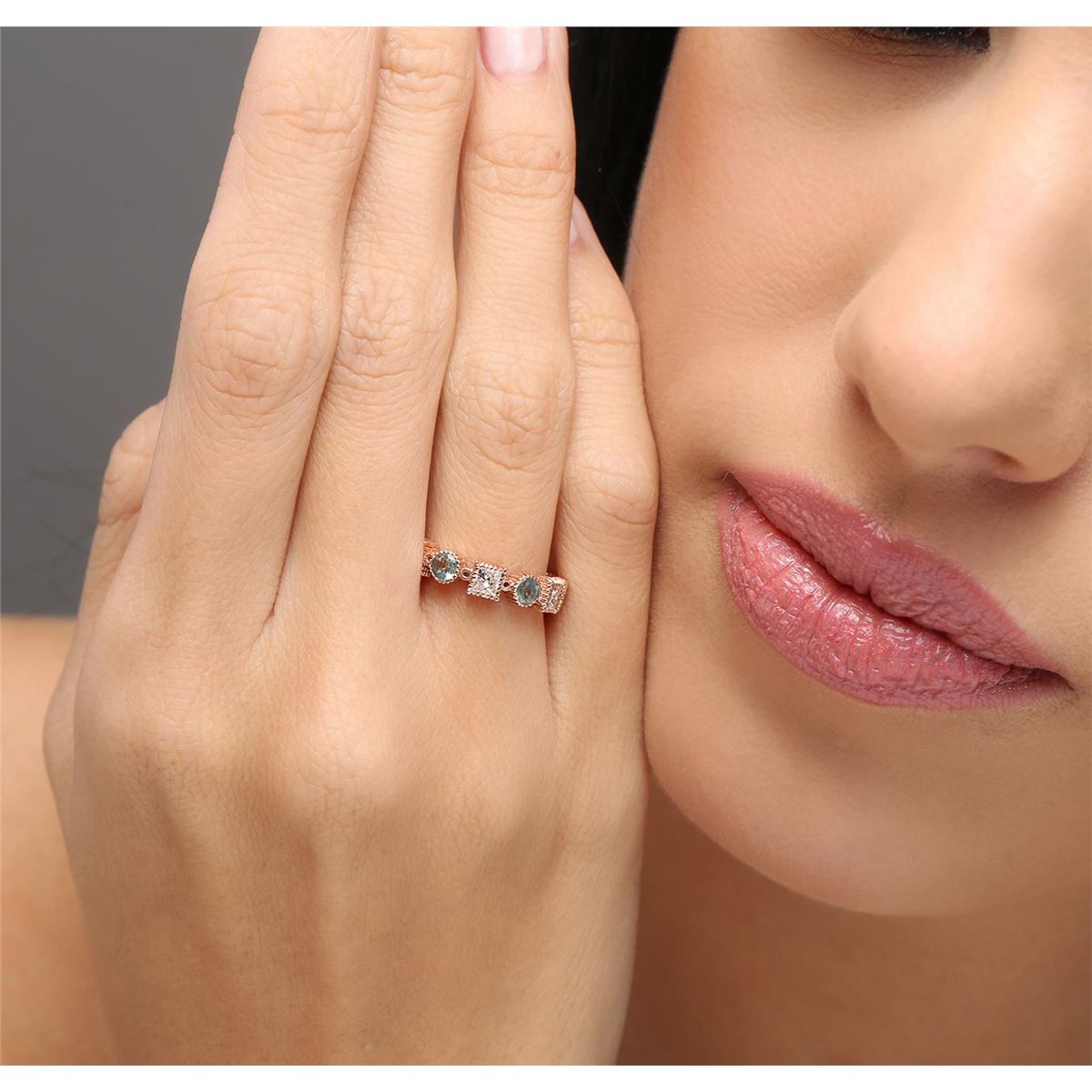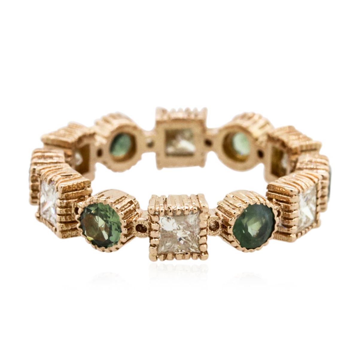 One electronically tested 14KT rose gold ladies cast green chrysoberyl and diamond ring. The ring features a continuous four millimeter wide green chrysoberyl and diamond ribbon. Bright polish finish with milgrain detailing. Condition is new, good workmanship. Containing: Six bezel set round brilliant cut natural green chrysoberyls, measuring 3.30 - 3.20 x 2.11 mm, approximate total weight of 1.02ct., clarity is slightly included, medium dark, very slightly grayish, very slightly bluish green color, (GIA vslbG 6/3), cut is good. Transmitting light with a minimum of distortion, transparent. Naturally occurring internal & external characteristics are present. Color grade is an average for the group. Graded in the setting. Six bezel set princess cut diamonds, measuring 3.30 x 3.10 x 2.00mm (depth est.) approximate total weight of 6 Stones = 1.10ct. Graded in the setting. Clarity: I-1 to I-2. Color: G - I. Total Weight of Colored Stones 1.02ct. Total Weight of Diamonds 1.10ct. Total Weight of Ring 2.96 grams. AIG Appraised at $2,540.00.
