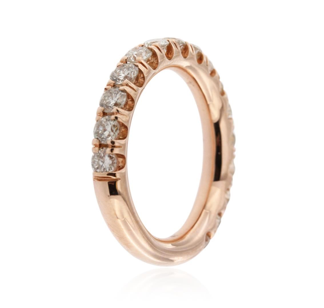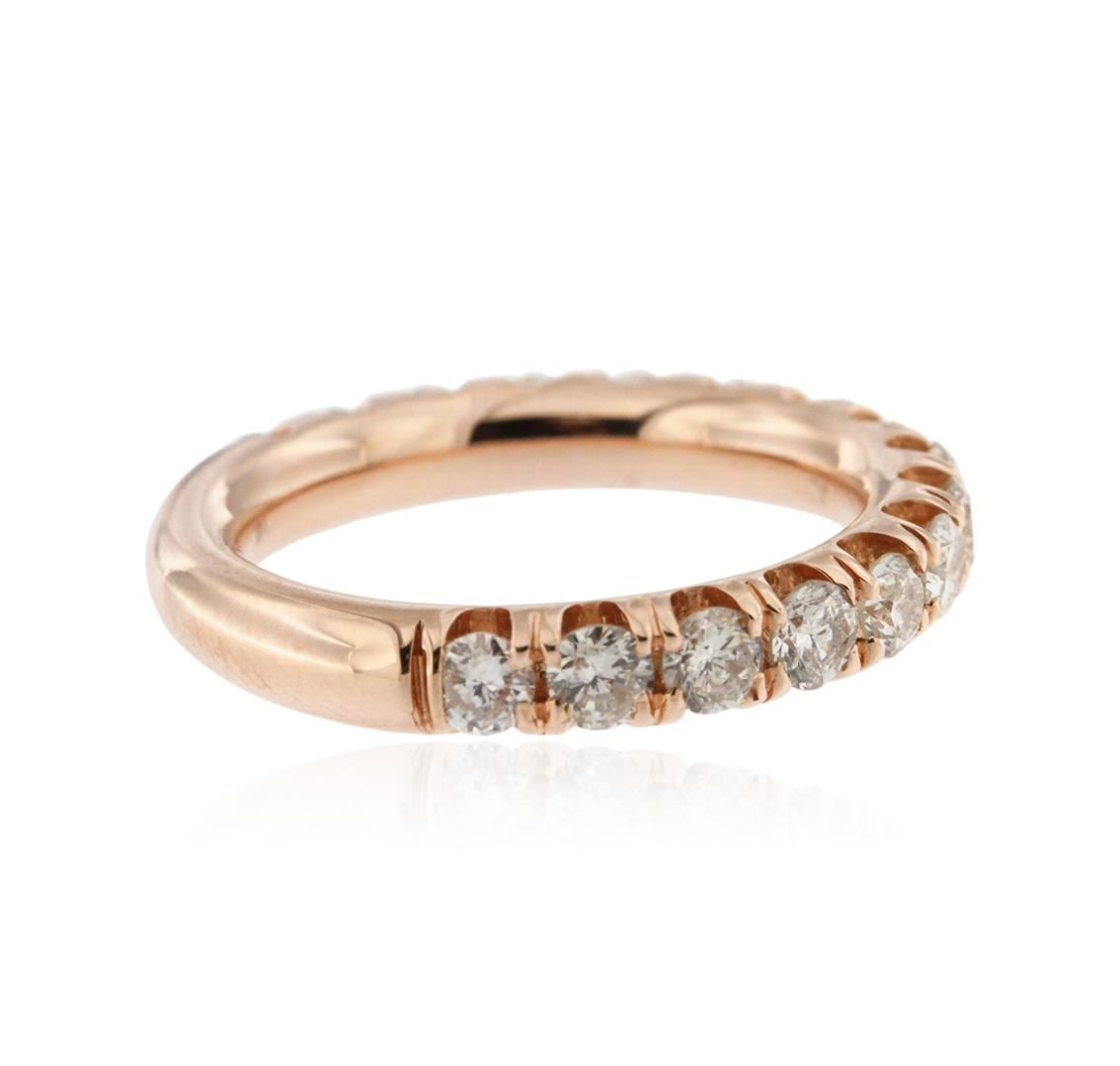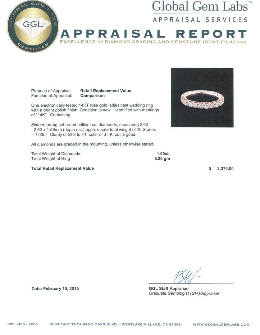 One electronically tested 14KT rose gold ladies cast wedding ring with a bright polish finish. Identified with markings of "14K". Condition is new. Containing: Sixteen prong set round brilliant cut diamonds, measuring 2.60 - 2.60 x 1.56mm (depth est.) approximate total weight of 16 Stones = 1.03ct. Clarity: SI-2 to I-1. Color: J - K, Cut is Good. All diamonds are graded in the mounting, unless otherwise stated. Total Weight of Diamonds 1.03ct. Total Weight of Ring 5.30 grams. GGL Appraised at $3,370.00.