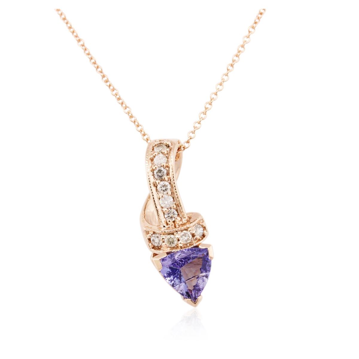 One pendant with chain featuring: 14KT rose gold weighing 3.34 grams containing one tanzanite with a total weight of 1.05ct and round diamonds with a total weight of 0.23cts.