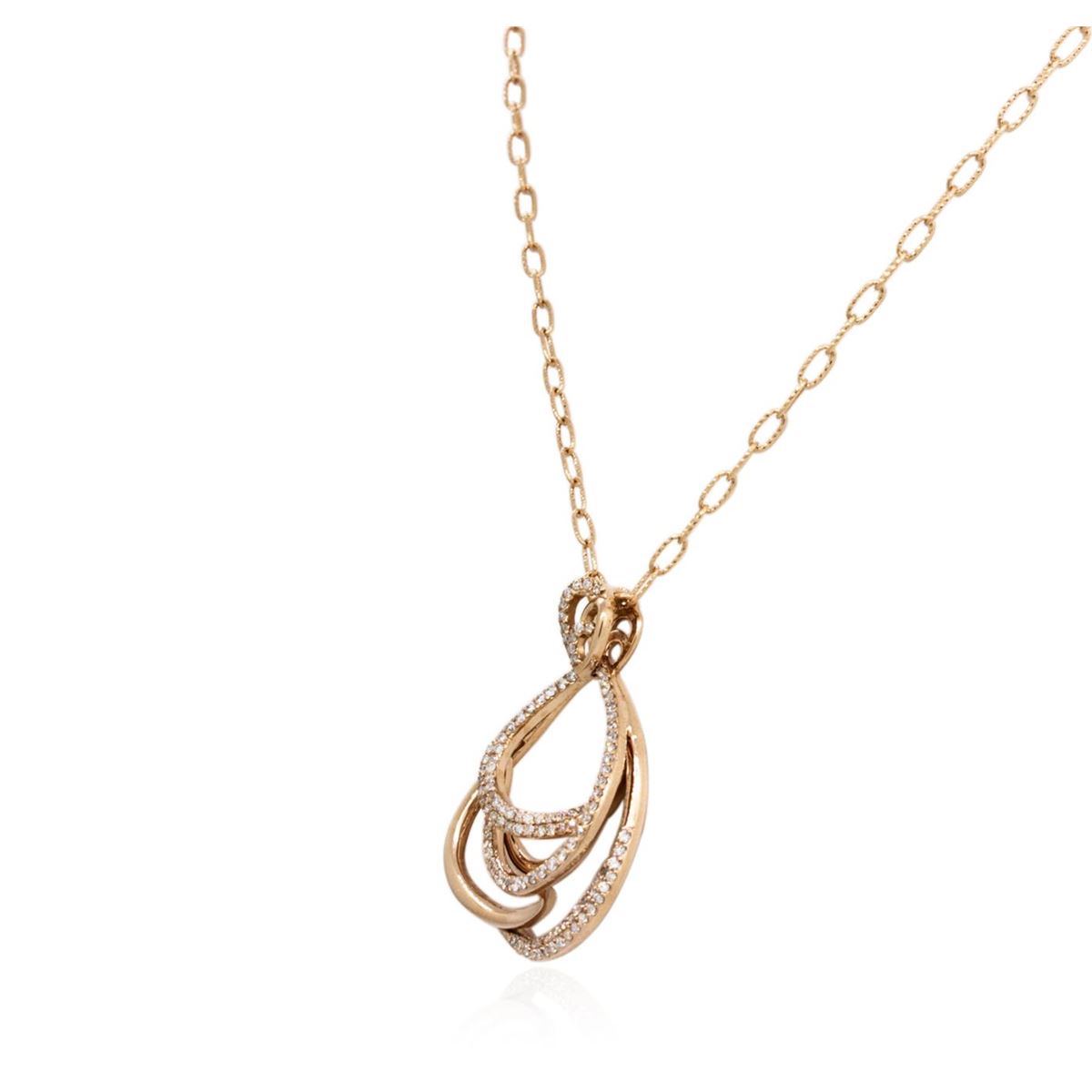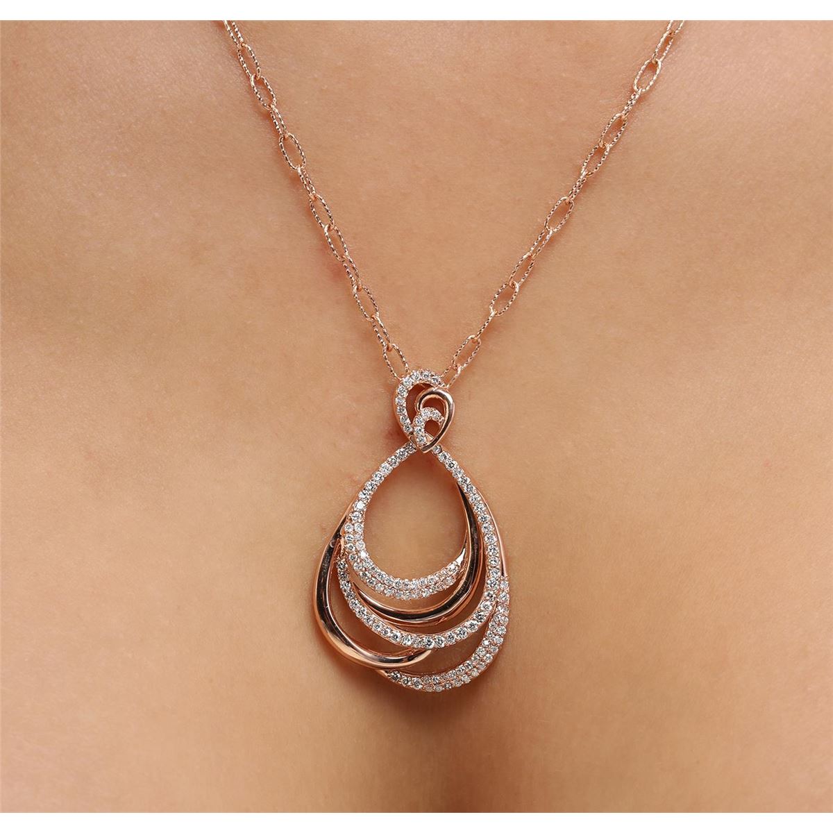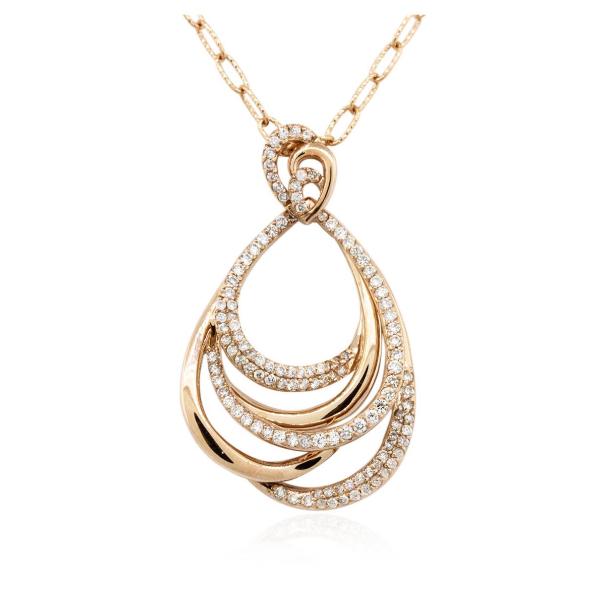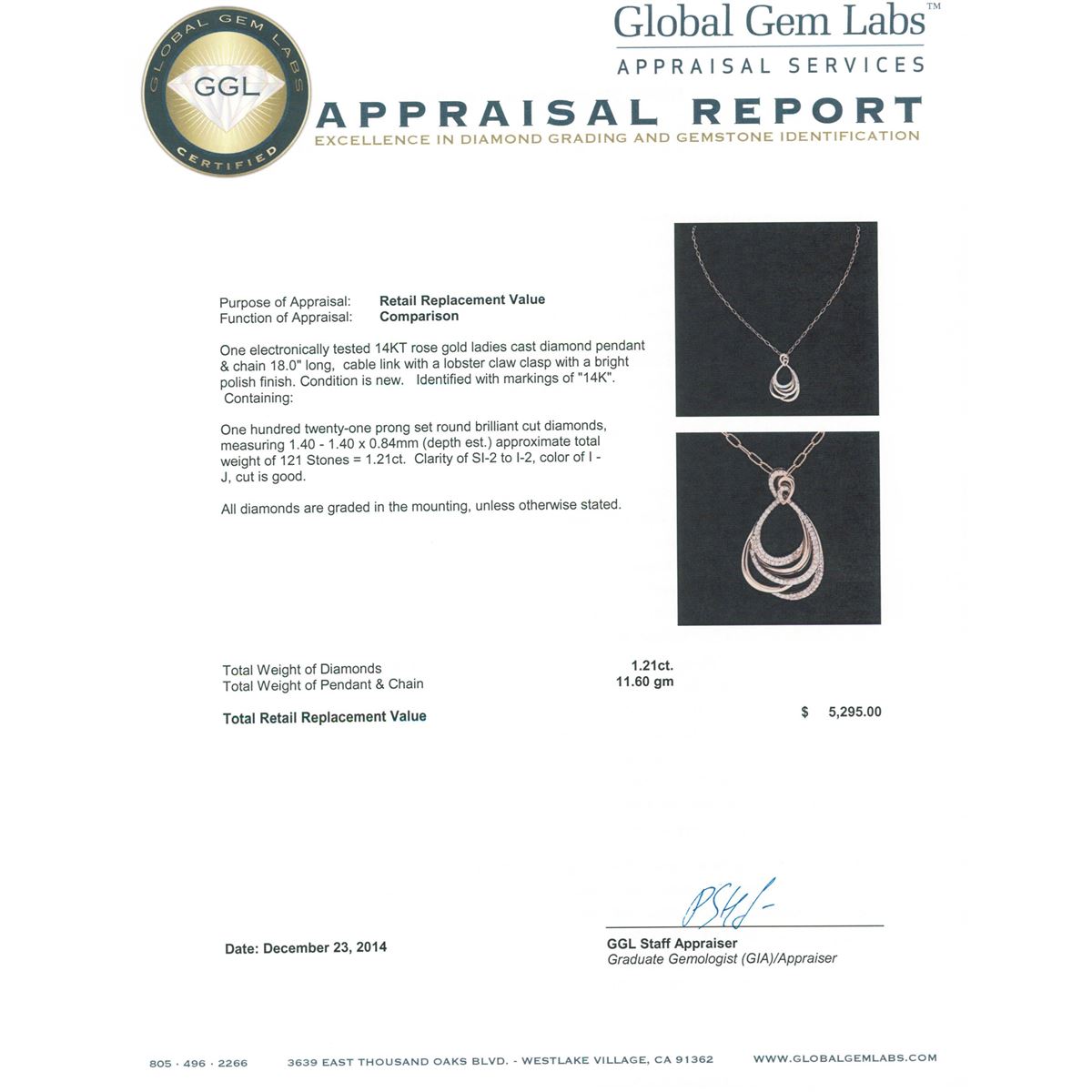 One electronically tested 14KT rose gold ladies cast diamond pendant & chain 18.0" long, cable link with a lobster claw clasp with a bright polish finish. Identified with markings of "14K". Condition is new. Containing: One Hundred Twenty-One prong set round brilliant cut diamonds, measuring 1.40 - 1.40 x 0.84mm (depth est.) approximate total weight of 121 Stones = 1.21ct. Clarity: SI-2 to I-2. Color: I - J, Cut is Good. All diamonds are graded in the mounting, unless otherwise stated. Total Weight of Diamonds 1.21ct. Total Weight of Pendant & Chain 11.60 grams. GGL Appraised at $5,295.00.