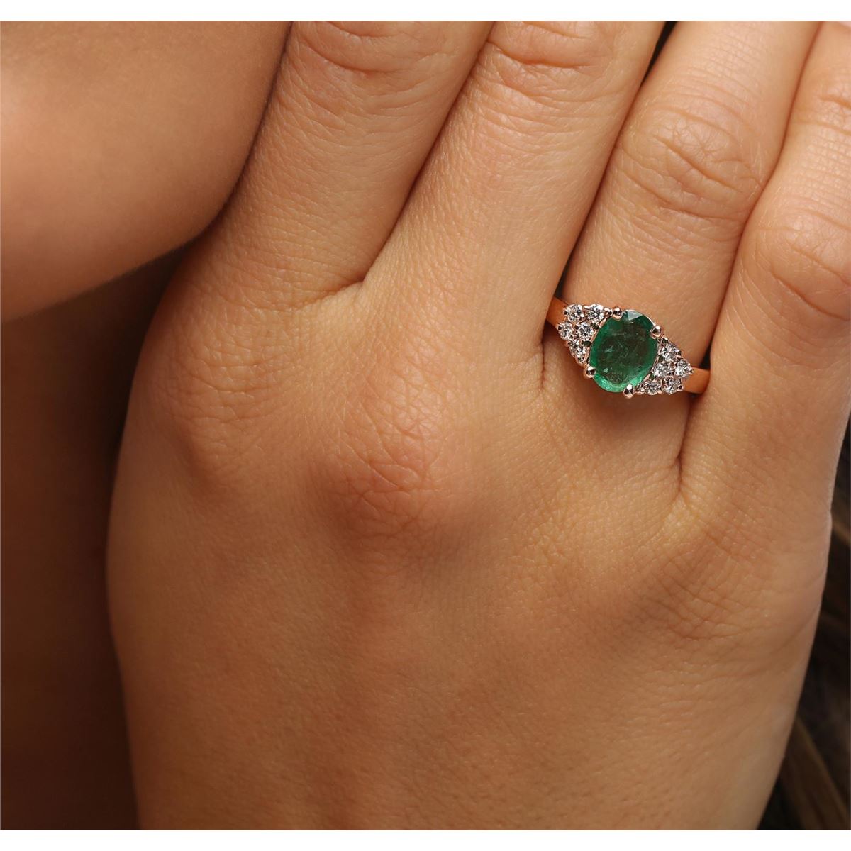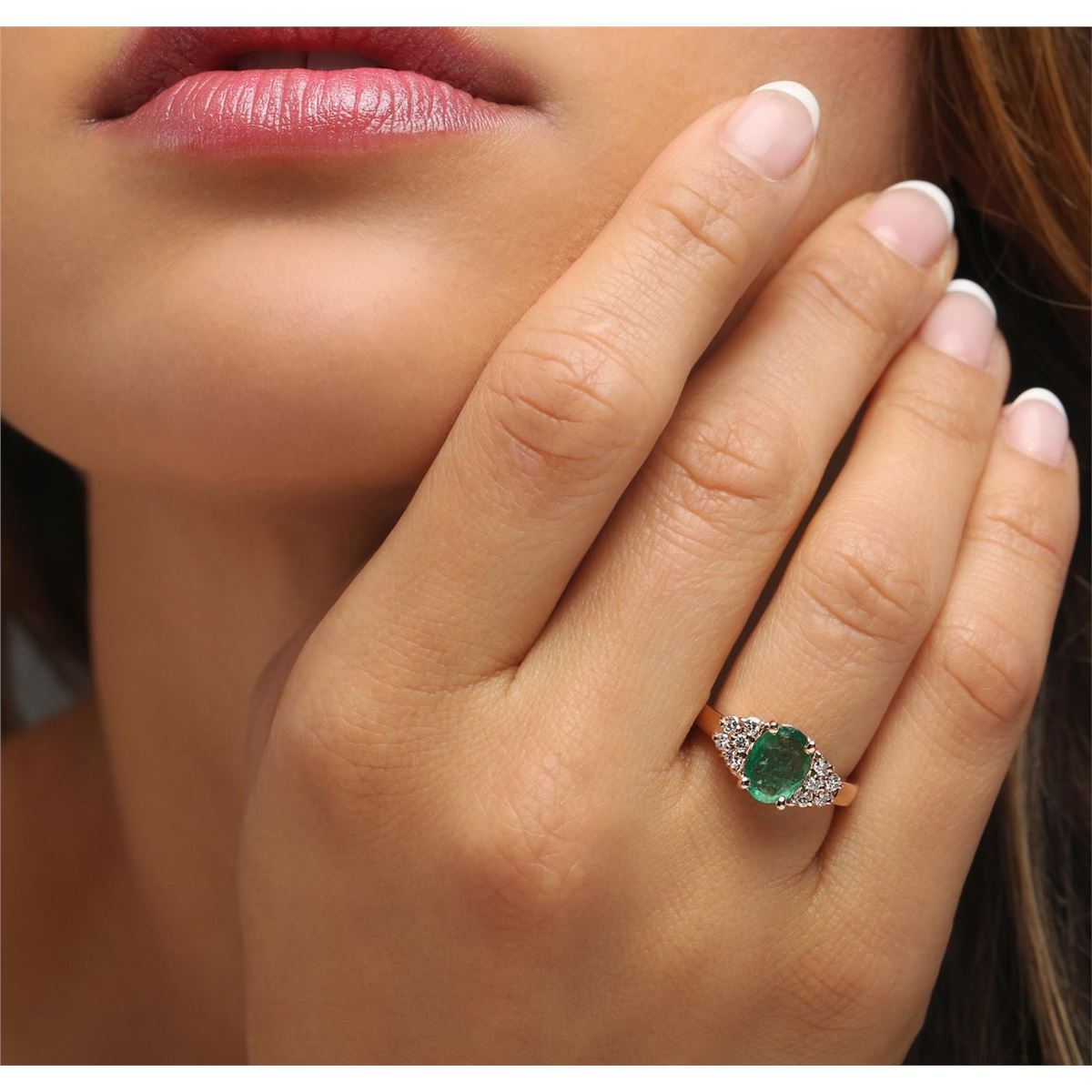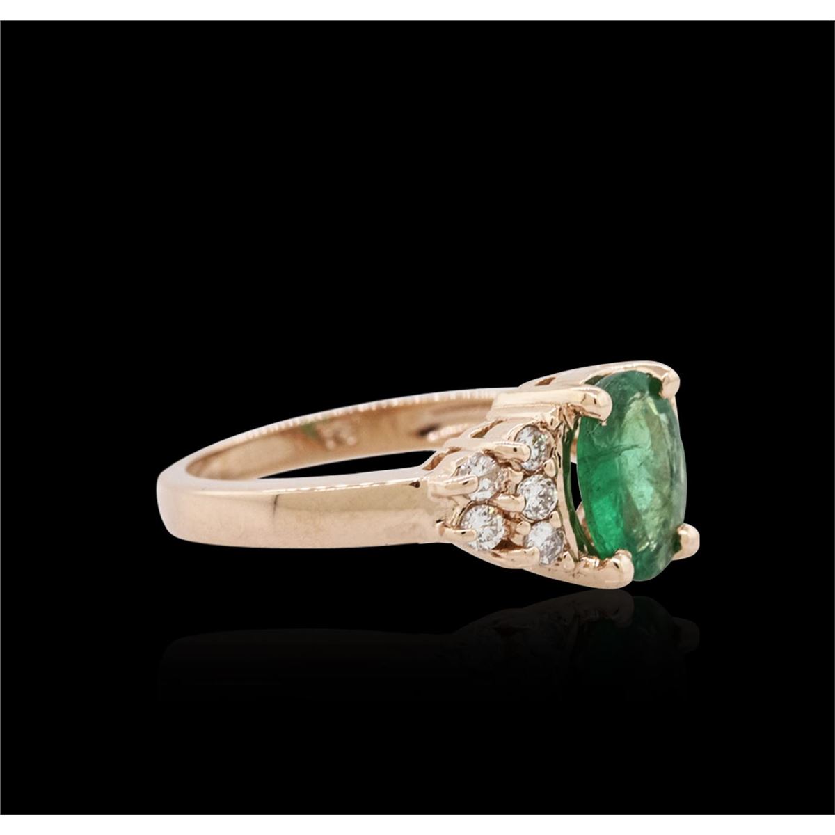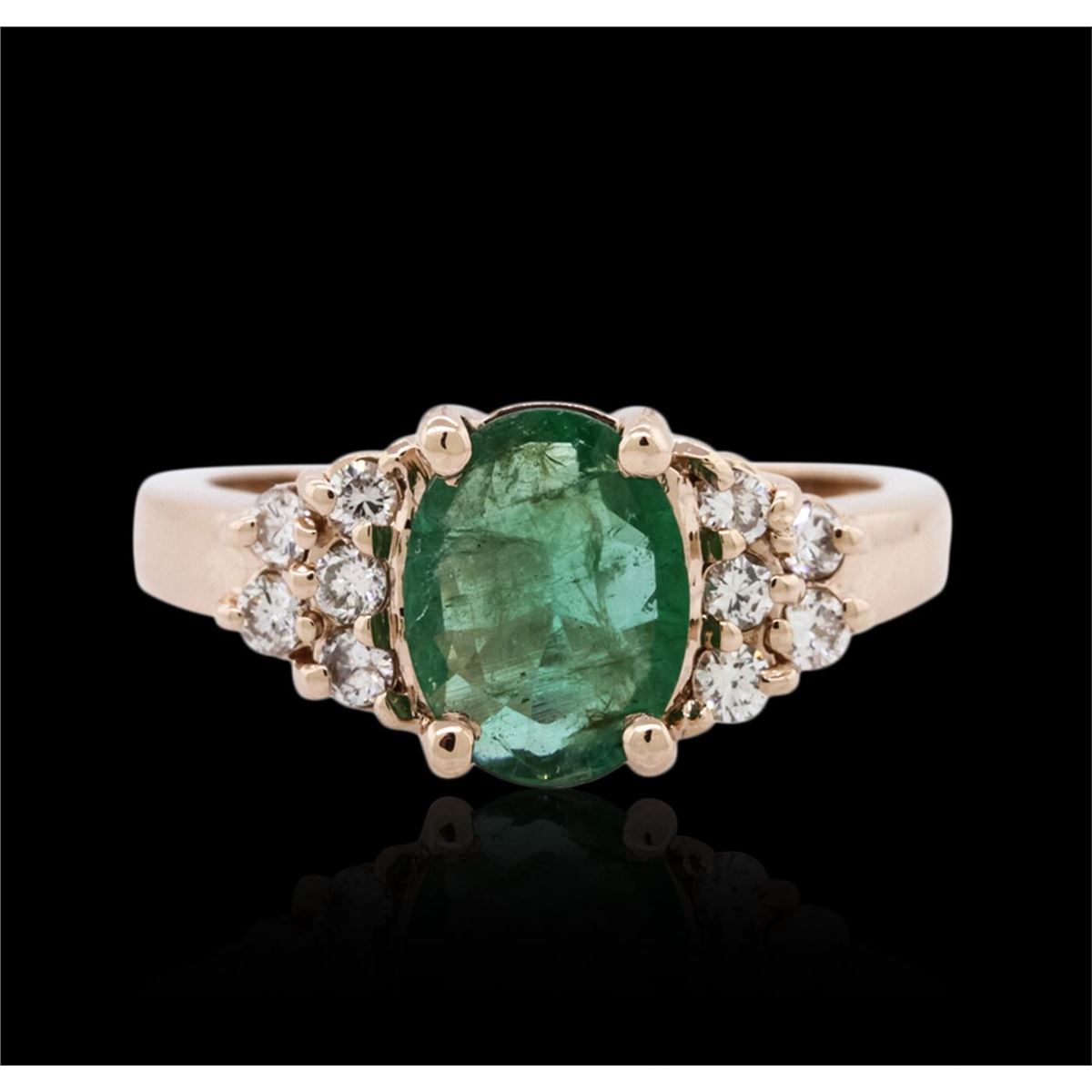 One ring featuring: 14KT rose gold weighing 5.00 grams containing one prong set oval cut emerald with a total weight of 1.21ct and prong set round cut diamonds with a total weight of 0.54cts.