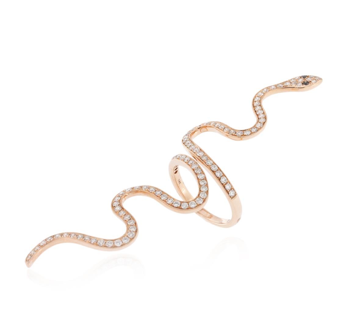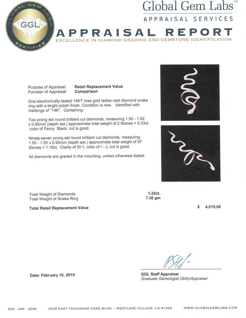 One electronically tested 14KT rose gold ladies cast diamond snake ring with a bright polish finish. Identified with markings of "14K". Condition is new. Containing: Two prong set round brilliant cut diamonds, measuring 1.50 - 1.50 x 0.90mm (depth est.) approximate total weight of 2 Stones = 0.03ct. color of Fancy Black, Cut is Good. Ninety-Seven prong set round brilliant cut diamonds, measuring 1.50 - 1.50 x 0.90mm (depth est.) approximate total weight of 97 Stones = 1.19ct. Clarity: SI-1. Color: I - J, Cut is Good. All diamonds are graded in the mounting, unless otherwise stated. Total Weight of Diamonds 1.22ct. Total Weight of Snake Ring 7.30 grams. GGL Appraised at $4,015.00.
