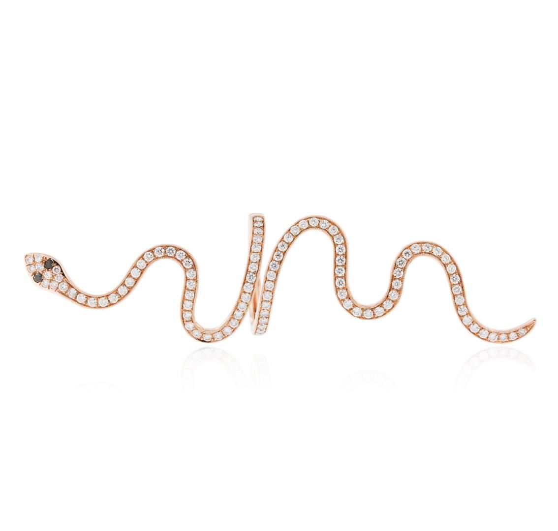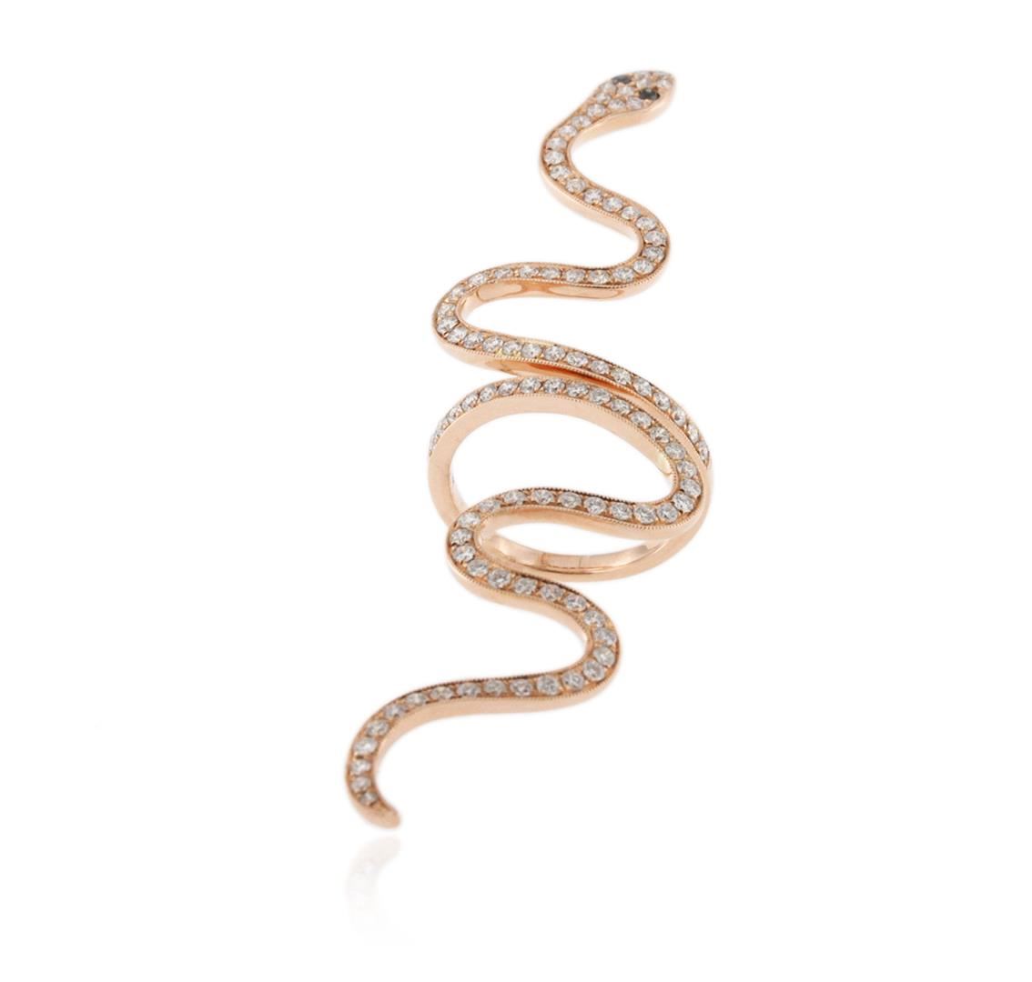 One electronically tested 14KT rose gold ladies cast diamond snake ring with a bright polish finish. Identified with markings of "14K". Condition is new. Containing: Two prong set round brilliant cut diamonds, measuring 1.50 - 1.50 x 0.90mm (depth est.) approximate total weight of 2 Stones = 0.03ct. color of Fancy Black, Cut is Good. Ninety-Seven prong set round brilliant cut diamonds, measuring 1.50 - 1.50 x 0.90mm (depth est.) approximate total weight of 97 Stones = 1.19ct. Clarity: SI-1. Color: I - J, Cut is Good. All diamonds are graded in the mounting, unless otherwise stated. Total Weight of Diamonds 1.22ct. Total Weight of Snake Ring 7.30 grams. GGL Appraised at $4,015.00.