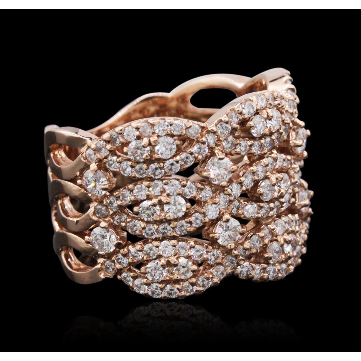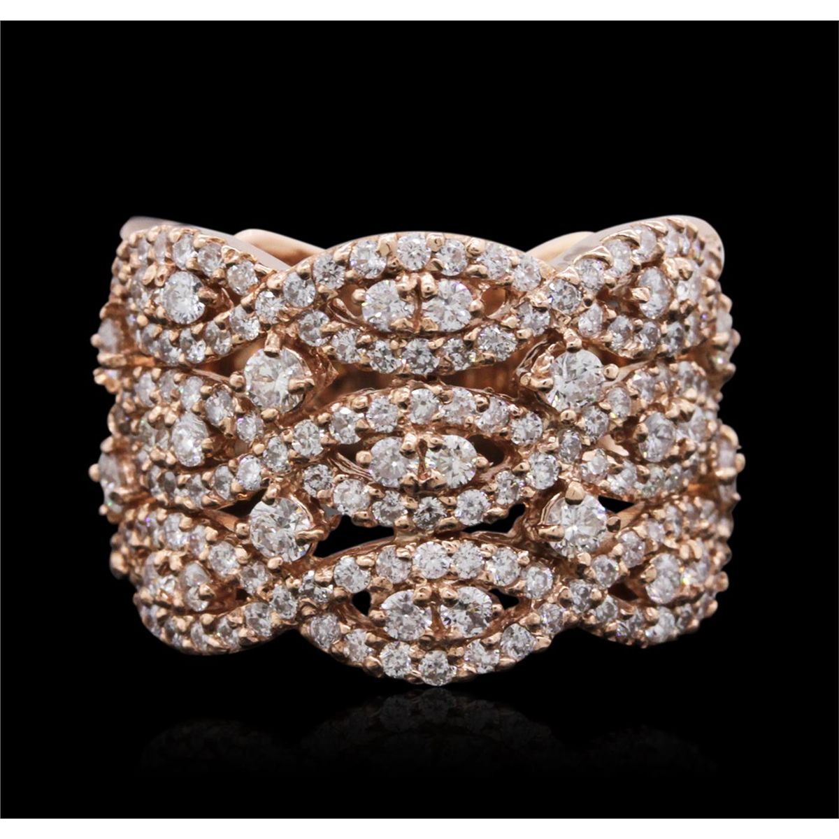 One electronically tested 14KT rose gold ladies combination cast & assembled diamond ring with a bright polish finish. Identified with markings of "K14". Condition is new. Containing: One Hundred Thirty-Eight prong set round brilliant cut diamonds, measuring 1.10 - 1.10 x 0.66mm (depth est.) approximate total weight of 138 Stones = 0.66ct. Clarity: I-1. Color: J, Cut is Good. Twenty-Six prong set round brilliant cut diamonds, measuring 2.00 - 1.60 x 1.08mm (depth est.) approximate total weight of 26 Stones = 0.55ct. Clarity: I-1. Color: I - J, Cut is Good. All diamonds are graded in the mounting, unless otherwise stated. Total Weight of Diamonds 1.22ct. Total Weight of Ring 10.50 grams. GGL Appraised at $5,010.00.