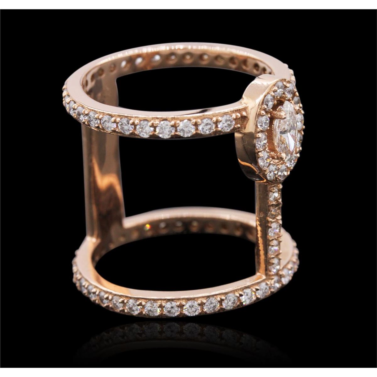 One electronically tested 14KT rose gold ladies combination cast & assembled diamond ring with a bright polish finish. Identified with markings of "14K". Condition is new. Containing: One prong set marquise shaped cut diamond, measuring 5.50 x 3.00 x 1.89mm (depth est.) approximate weight of 0.18ct. Clarity: SI-1. Color: K, Cut is Good. Eighty-Five prong set round brilliant cut diamonds, measuring 1.50 - 1.50 x 0.90mm (depth est.) approximate total weight of 85 Stones = 1.05ct. Clarity: SI-2 to I-1. Color: I - J, Cut is Good. All diamonds are graded in the mounting, unless otherwise stated. Total Weight of Diamonds 1.23ct. Total Weight of Ring 6.40 grams. GGL Appraised at $5,465.00.