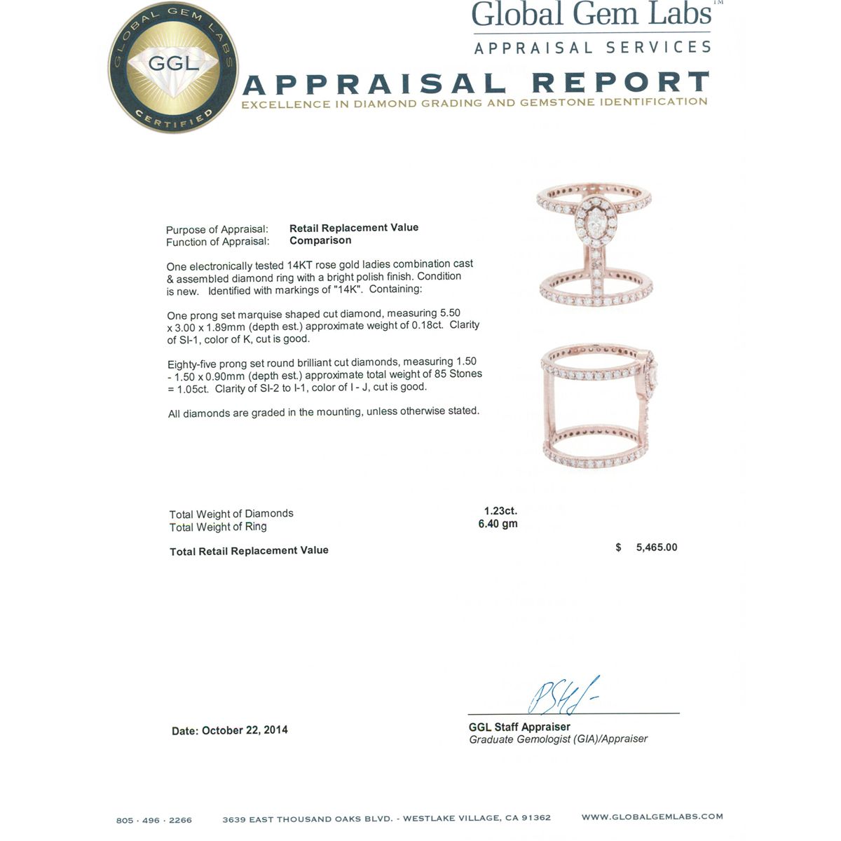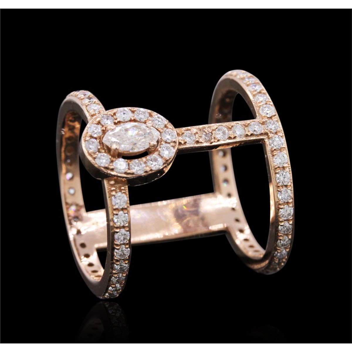One electronically tested 14KT rose gold ladies combination cast & assembled diamond ring with a bright polish finish. Identified with markings of "14K". Condition is new. Containing: One prong set marquise shaped cut diamond, measuring 5.50 x 3.00 x 1.89mm (depth est.) approximate weight of 0.18ct. Clarity: SI-1. Color: K, Cut is Good. Eighty-Five prong set round brilliant cut diamonds, measuring 1.50 - 1.50 x 0.90mm (depth est.) approximate total  weight of 85 Stones = 1.05ct. Clarity: SI-2 to I-1. Color: I - J, Cut is Good. All diamonds are graded in the mounting, unless otherwise stated. Total Weight of Diamonds 1.23ct. Total Weight of Ring 6.40 grams. GGL Appraised at $5,465.00.