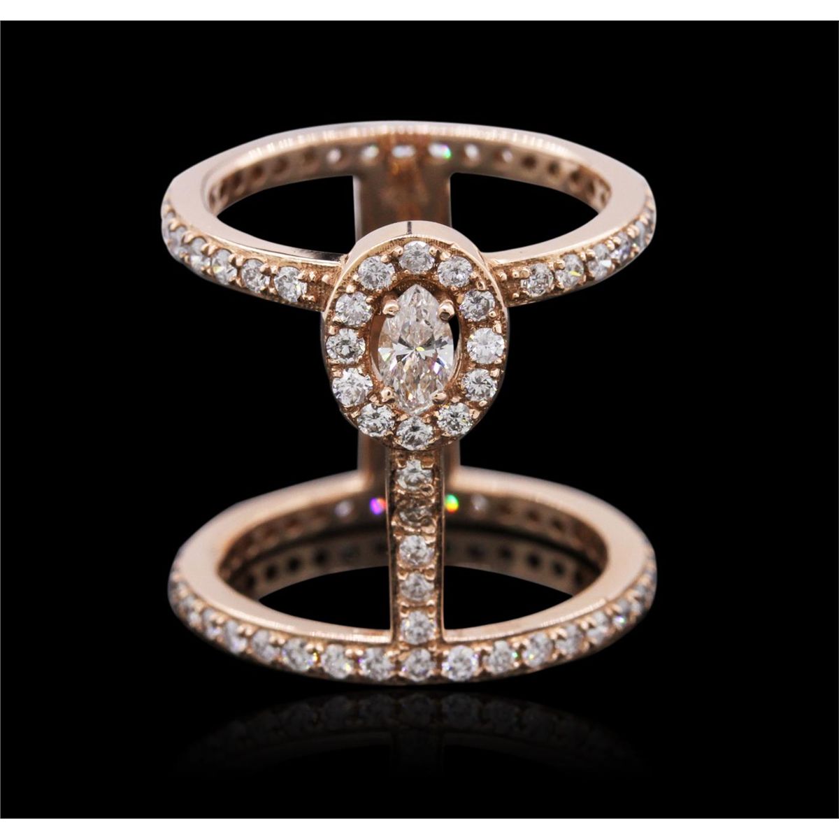 One electronically tested 14KT rose gold ladies combination cast & assembled diamond ring with a bright polish finish. Identified with markings of "14K". Condition is new. Containing: One prong set marquise shaped cut diamond, measuring 5.50 x 3.00 x 1.89mm (depth est.) approximate weight of 0.18ct. Clarity: SI-1. Color: K, Cut is Good. Eighty-Five prong set round brilliant cut diamonds, measuring 1.50 - 1.50 x 0.90mm (depth est.) approximate total weight of 85 Stones = 1.05ct. Clarity: SI-2 to I-1. Color: I - J, Cut is Good. All diamonds are graded in the mounting, unless otherwise stated. Total Weight of Diamonds 1.23ct. Total Weight of Ring 6.40 grams. GGL Appraised at $5,465.00.