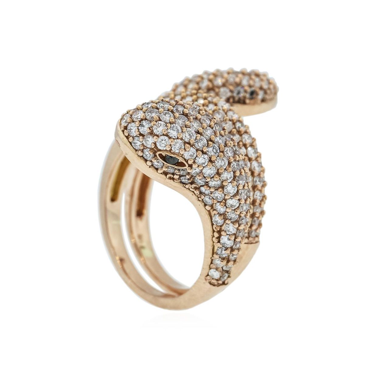 One electronically tested 14KT rose gold ladies cast snake diamond ring with a bright polish finish. Identified with markings of "14K". Condition is new. Containing: Two prong set round brilliant cut diamonds, measuring 1.20 - 1.20 x 0.72mm (depth est.) approximate total weight of 2 Stones = 0.01ct. Cut is Good. One Hundred Twenty-Two prong set round brilliant cut diamonds, measuring 1.50 - 1.30 x 0.84mm (depth est.) approximate total weight of 122 Stones = 1.22ct. Clarity: SI-1 to I-1. Color: I - J, Cut is Good. All diamonds are graded in the mounting, unless otherwise stated. Total Weight of Diamonds 1.23ct. Total Weight of Diamond Ring 11.60 grams. GGL Appraised at $6,425.00.