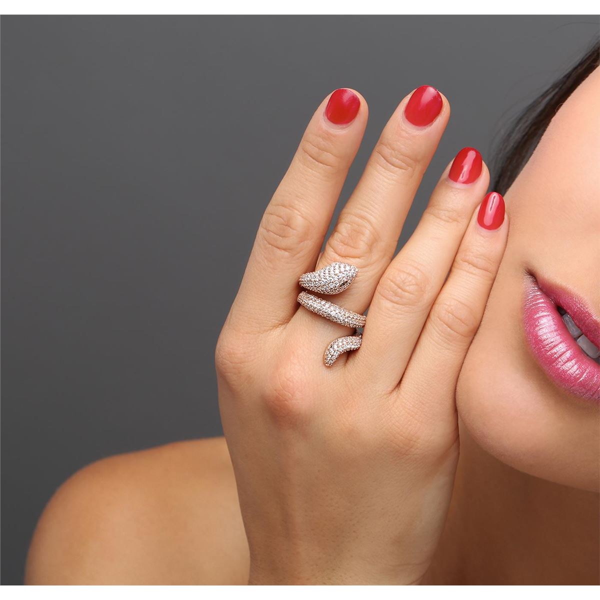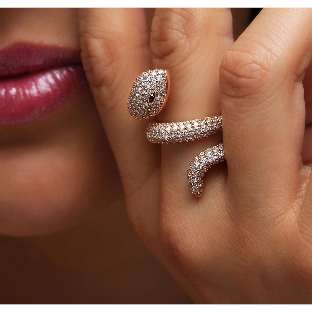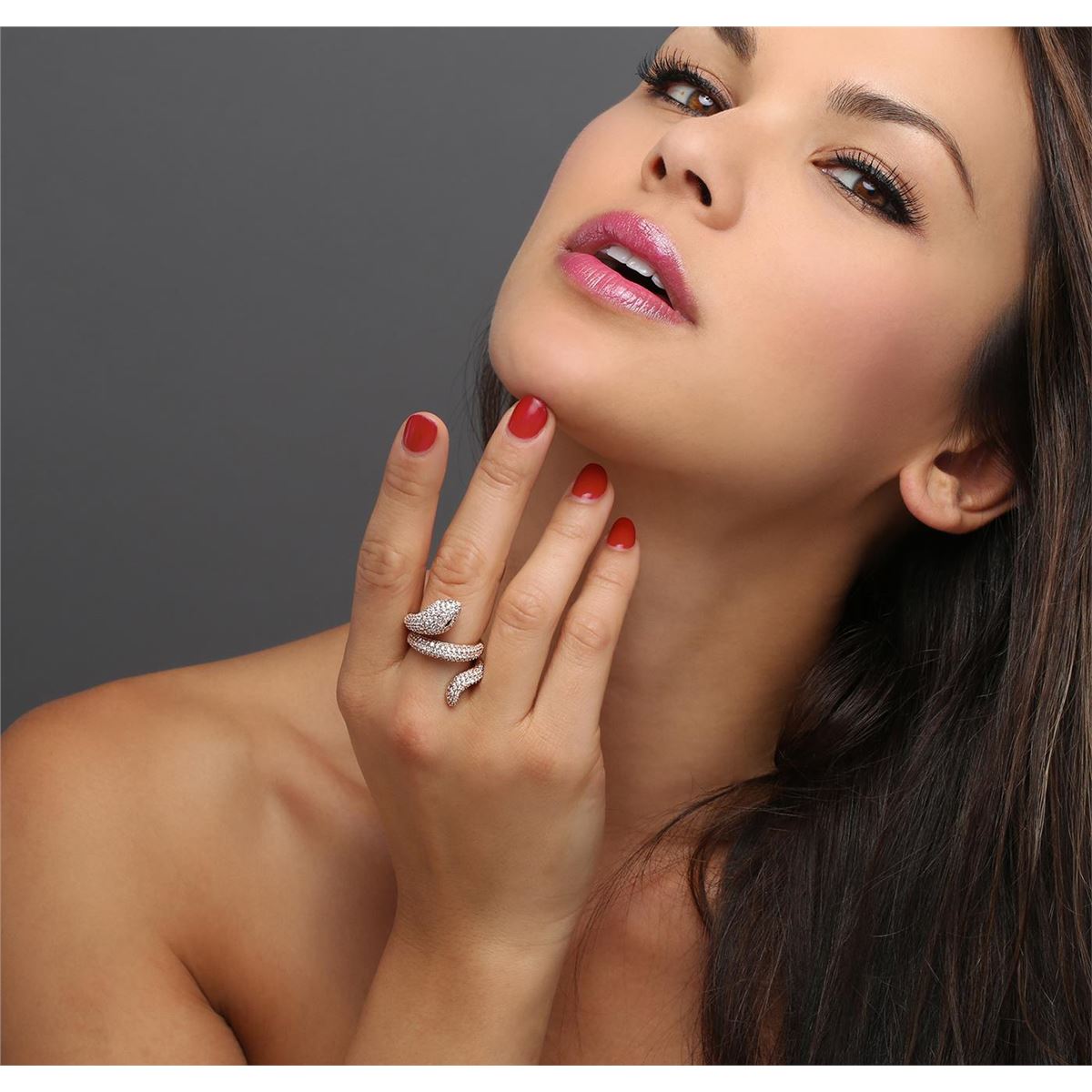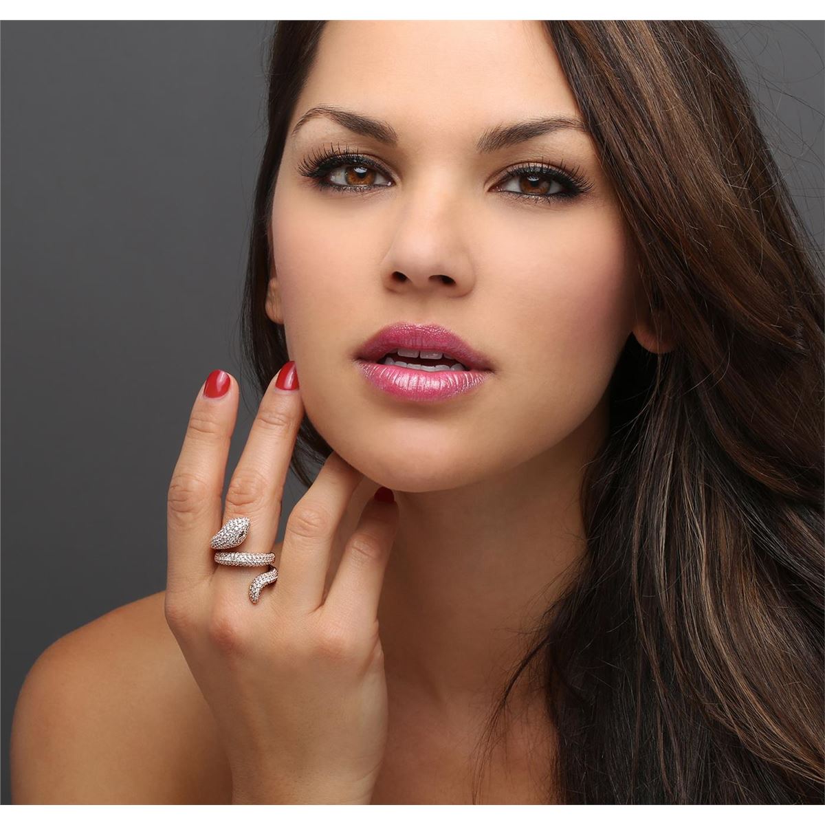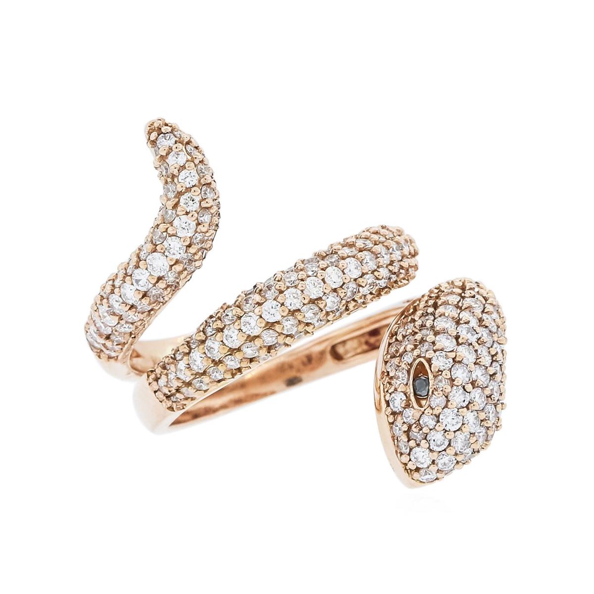 One electronically tested 14KT rose gold ladies cast snake diamond ring with a bright polish finish. Identified with markings of "14K". Condition is new. Containing: Two prong set round brilliant cut diamonds, measuring 1.20 - 1.20 x 0.72mm (depth est.) approximate total weight of 2 Stones = 0.01ct. Cut is Good. One Hundred Twenty-Two prong set round brilliant cut diamonds, measuring 1.50 - 1.30 x 0.84mm (depth est.) approximate total weight of 122 Stones = 1.22ct. Clarity: SI-1 to I-1. Color: I - J, Cut is Good. All diamonds are graded in the mounting, unless otherwise stated. Total Weight of Diamonds 1.23ct. Total Weight of Diamond Ring 11.60 grams. GGL Appraised at $6,425.00.