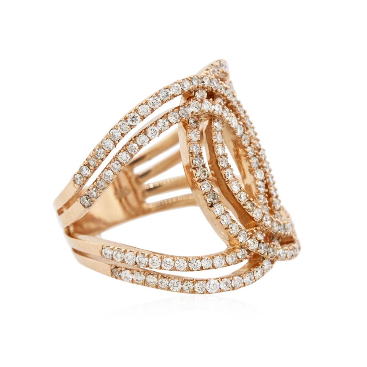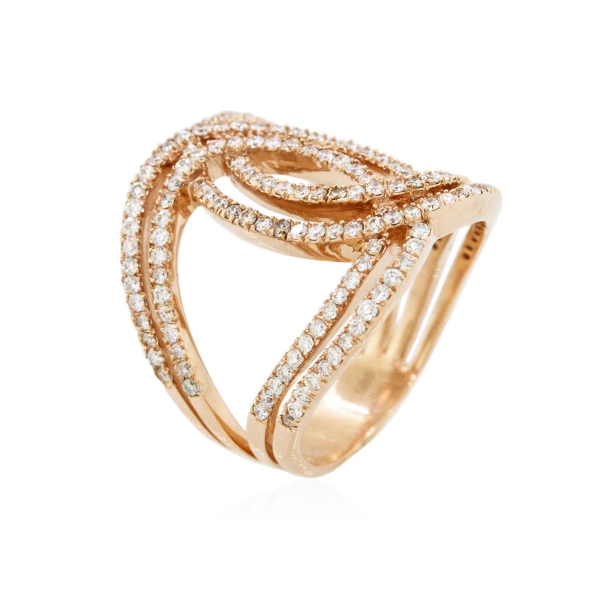 One electronically tested 14KT rose gold ladies cast diamond ring with a bright polish finish. Condition is new, good workmanship. The ring features intertwining diamond ribbons, completed by a four and one-half millimeter wide band. Identified with markings of "585". Containing: One Hundred Sixty-Three prong set round brilliant cut diamonds, measuring 1.30 - 1.20 x 0.75mm (depth est.) approximate. Total Weight of 163 Stones = 1.25ct. Graded in the setting. Clarity: I-1 to I-2. Color: H - J. Total Weight of Diamonds 1.25ct. Total Weight of Ring 6.31gm. AIG Appraised at $4,800.00.