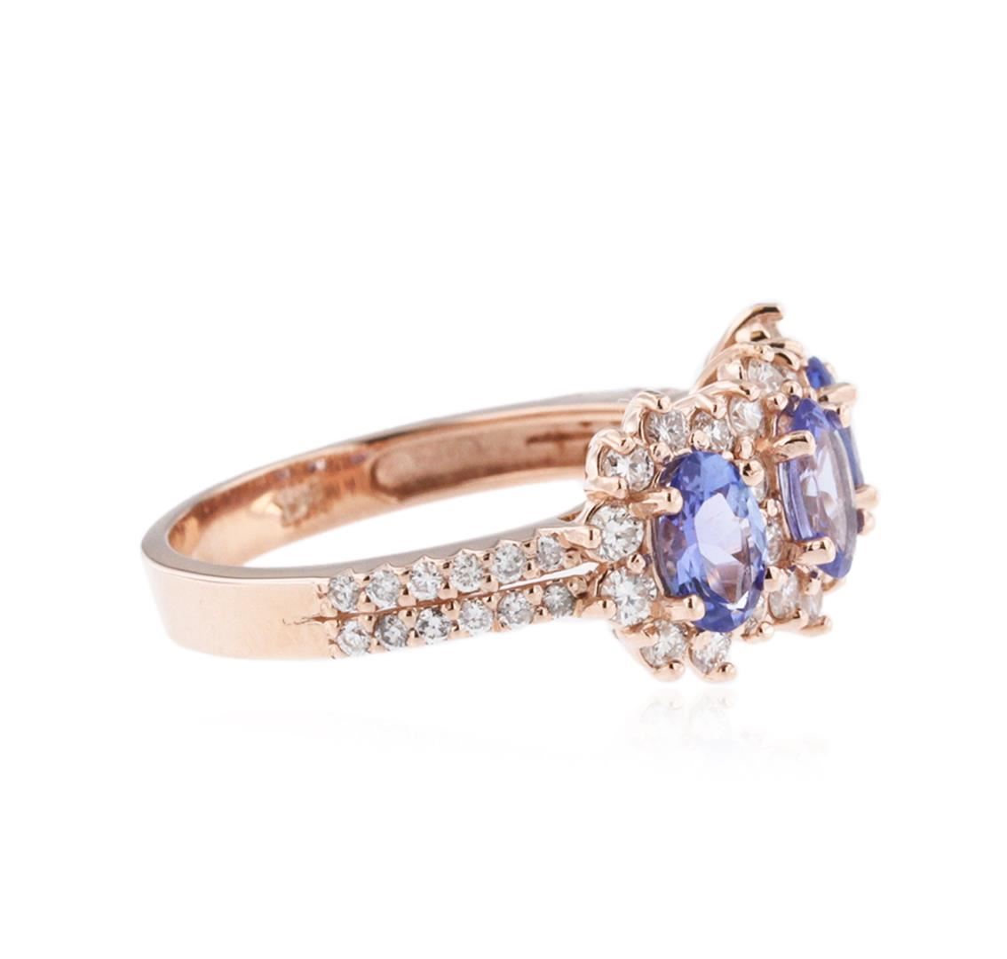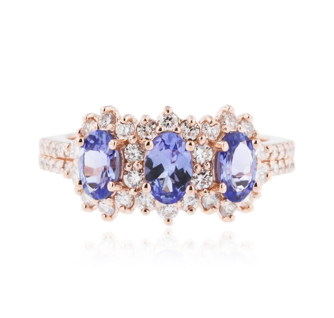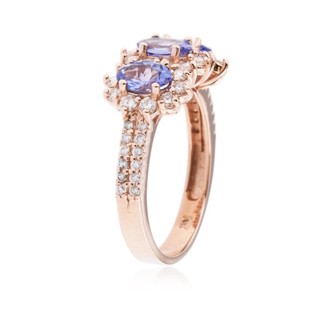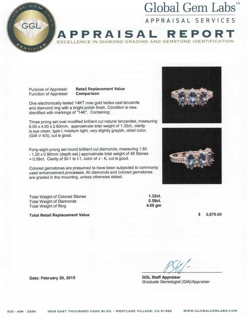 One electronically tested 14KT rose gold ladies cast tanzanite and diamond ring with a bright polish finish. Identified with markings of "14K". Condition is new. Containing: Three prong set oval modified brilliant cut natural tanzanites, measuring 6.00 x 4.00 x 2.60mm, approximate total weight of 1.32ct., clarity is eye clean, type I, medium light, very slightly grayish, violet color, (GIA V 4/3), cut is good. Forty-Eight prong set round brilliant cut diamonds, measuring 1.80 - 1.20 x 0.90mm (depth est.) approximate total weight of 48 Stones = 0.59ct. Clarity: SI-1 to I-1. Color: J - K, Cut is Good. Colored gemstones are presumed to have been subjected to commonly used enhancement processes. All diamonds and colored gemstones are graded in the mounting, unless otherwise stated. Total Weight of Colored Stones 1.32ct. Total Weight of Diamonds 0.59ct. Total Weight of Ring 4.00 grams. GGL Appraised at $2,670.00.