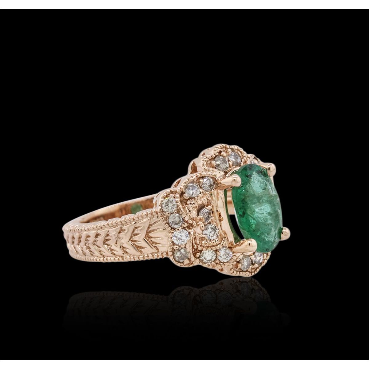 One ring featuring: 14KT rose gold weighing 7.80 grams containing one prong set oval cut emerald with a total weight of 1.36ct and pave set round cut diamonds with a total weight of 0.44cts.