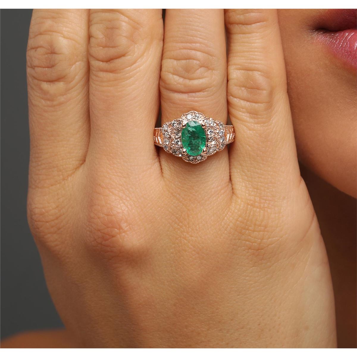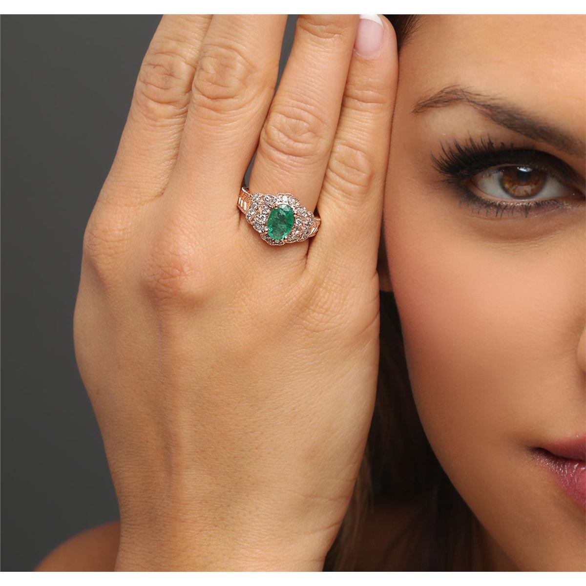 One ring featuring: 14KT rose gold weighing 7.80 grams containing one prong set oval cut emerald with a total weight of 1.36ct and pave set round cut diamonds with a total weight of 0.44cts.