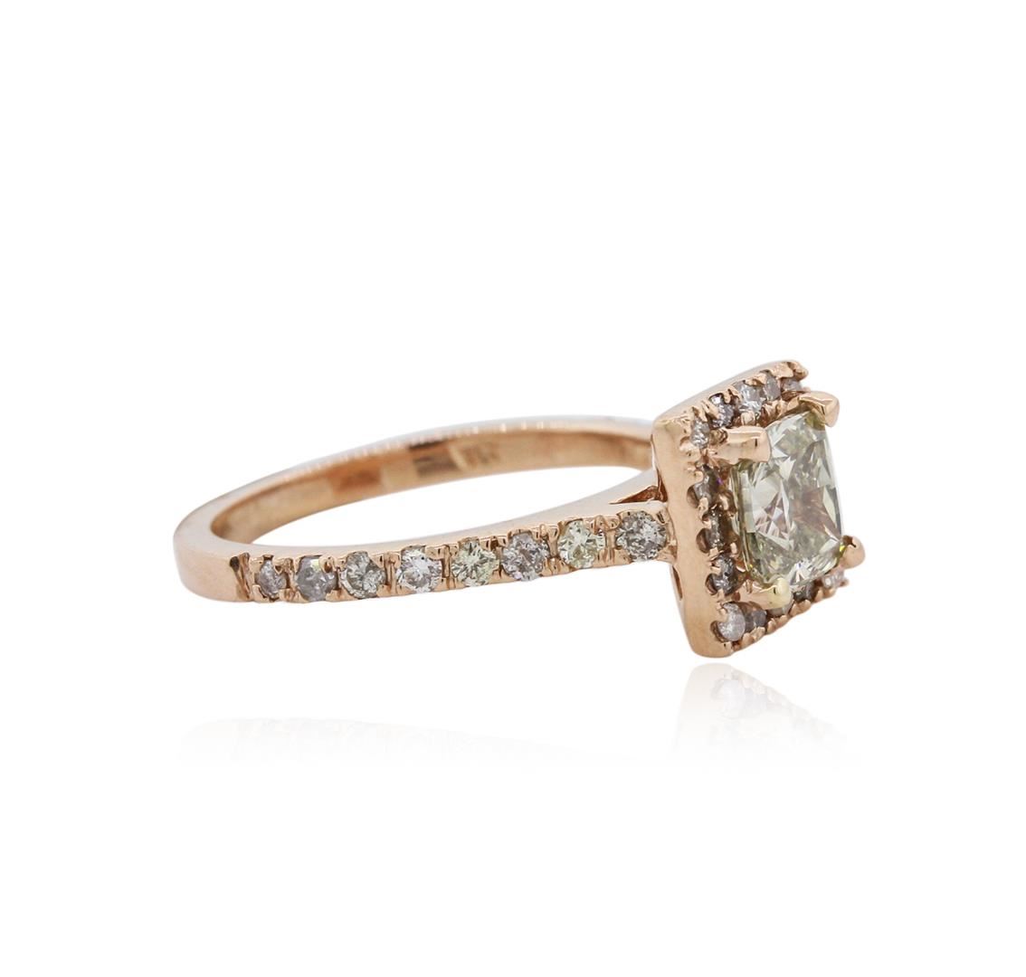 One electronically tested 14KT rose gold ladies cast diamond ring with a bright polish finish. Identified with markings of "14K". Condition is new. Containing: One prong set cushion cut diamond, measuring 5.90 x 5.50 x 3.90mm (depth est.) approximate weight of 1.08ct. Clarity: VS-2, color of Fancy Light Green, Cut is Good. Whether the color of this diamond is of natural origin or an artificial process cannot currently be determined. Thirty prong set round brilliant cut diamonds, measuring 1.50 - 1.30 x 0.84mm (depth est.) approximate total weight of 30 Stones = 0.30ct. Clarity: I-1 to I-2. Color: J - K. All diamonds are graded in the mounting, unless otherwise stated. Total Weight of Diamonds 1.38ct. Total Weight of Ring 3.70 grams. GGL Appraised at $5,020.00.