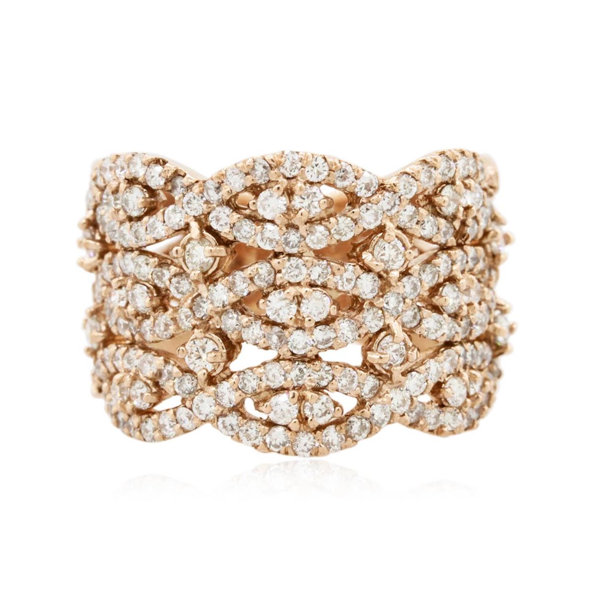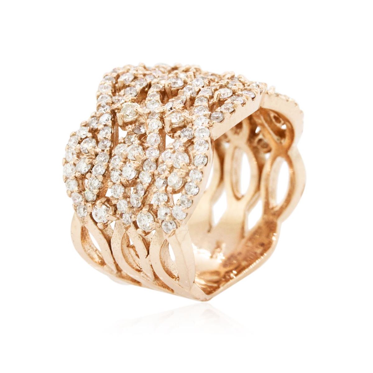 One electronically tested 14KT rose gold ladies cast diamond ring with a bright polish finish. Identified with markings of "K14". Condition is new. Containing: Twenty-Six prong set round brilliant cut diamonds, measuring 1.50 - 1.50 x 0.90mm (depth est.) approximate total weight of 26 Stones = 0.32ct. Clarity: I-1 to I-2. Color: H - I, Cut is Good. One Hundred Thirty-Five prong set round brilliant cut diamonds, measuring 1.30 - 1.30 x 0.78mm (depth est.) approximate total weight of 135 Stones = 1.08ct. Clarity: I-1 to I-2. Color: H - I, Cut is Good. All diamonds are graded in the mounting, unless otherwise stated. Total Weight of Diamonds 1.40ct. Total Weight of Ring 10.30 grams. GGL Appraised at $4,755.00.