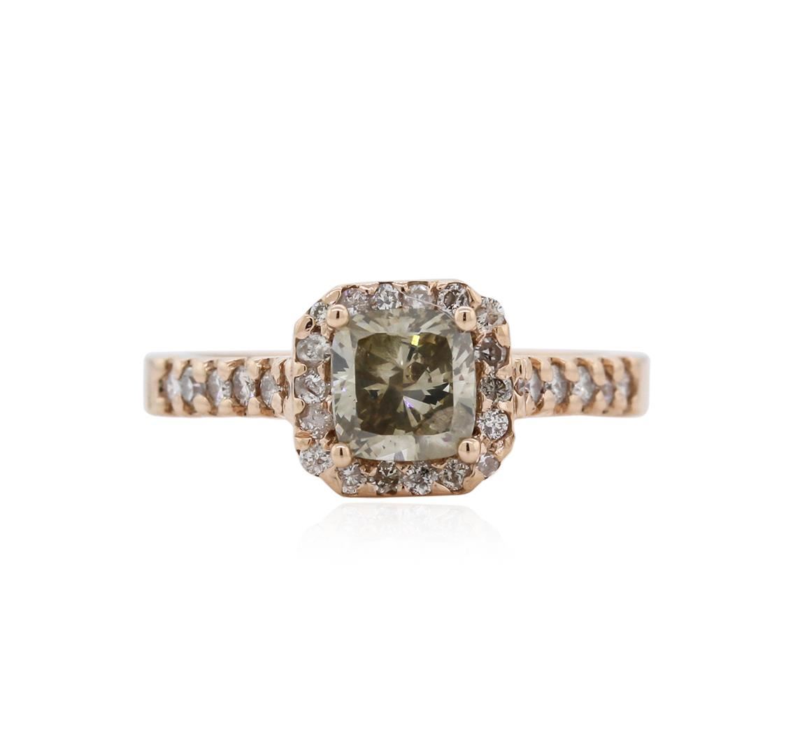 One electronically tested 14KT rose gold ladies cast diamond ring with a bright polish finish. Identified with markings of "14K". Condition is new. Containing: One prong set cushion cut diamond, measuring 5.70 x 5.70 x 4.28mm (depth est.) approximate weight of 1.18ct. Clarity: I-1, color of Fancy Light Green, Cut is Good. Whether the color of this diamond is of natural origin or an artificial process cannot currently be determined. Thirty prong set round brilliant cut diamonds, measuring 1.30 - 1.30 x 0.78mm (depth est.) approximate total weight of 30 Stones = 0.24ct. Clarity: I-1 to I-2. Color: J - K, Cut is Good. All diamonds are graded in the mounting, unless otherwise stated. Total Weight of Diamonds 1.42ct. Total Weight of Ring 4.30 grams. GGL Appraised at $4,905.00.