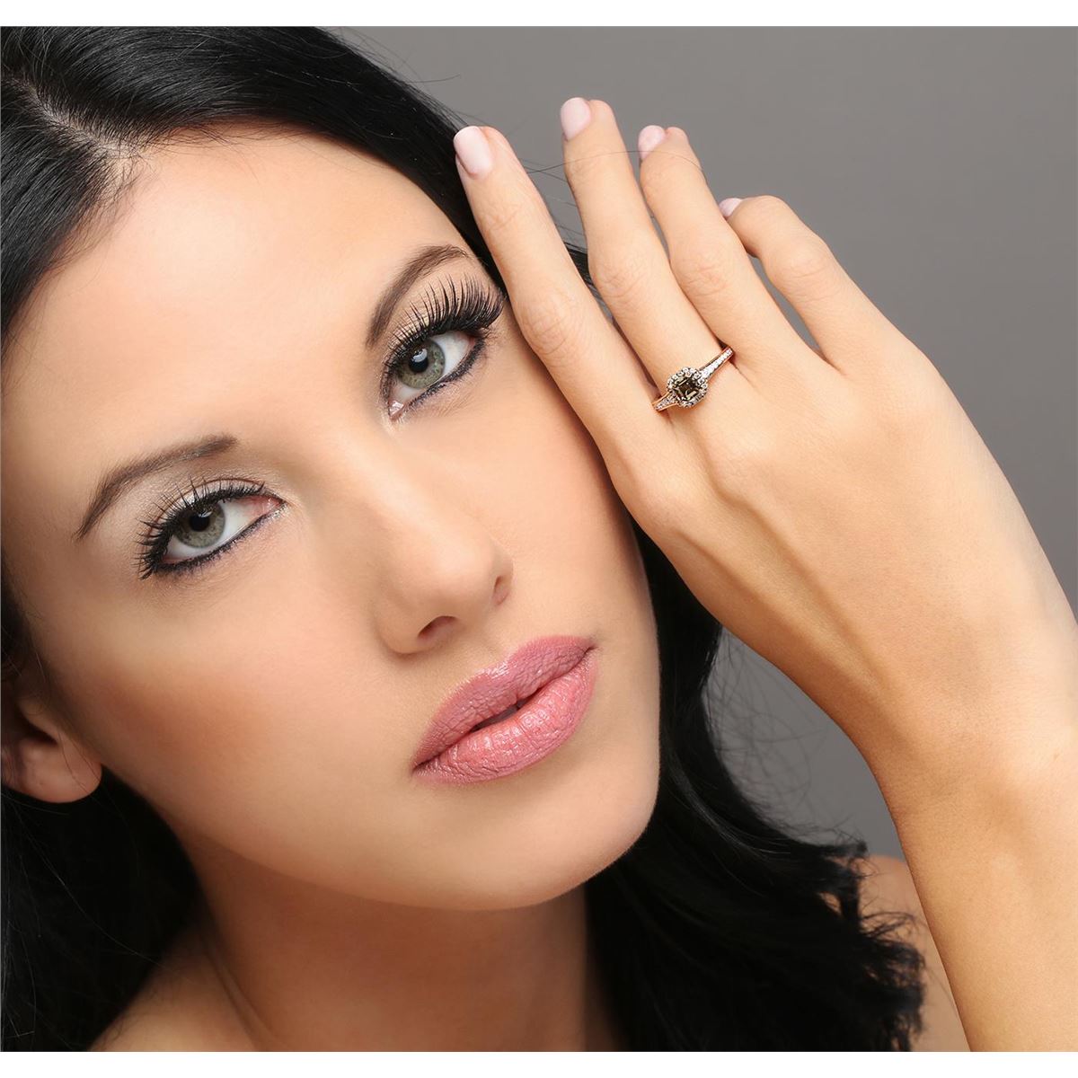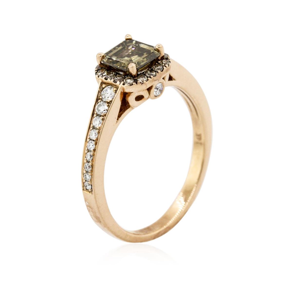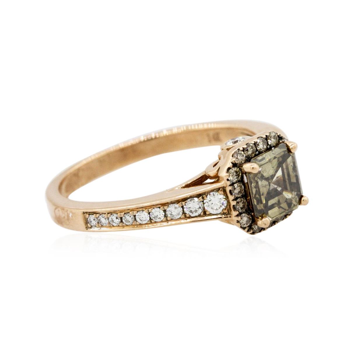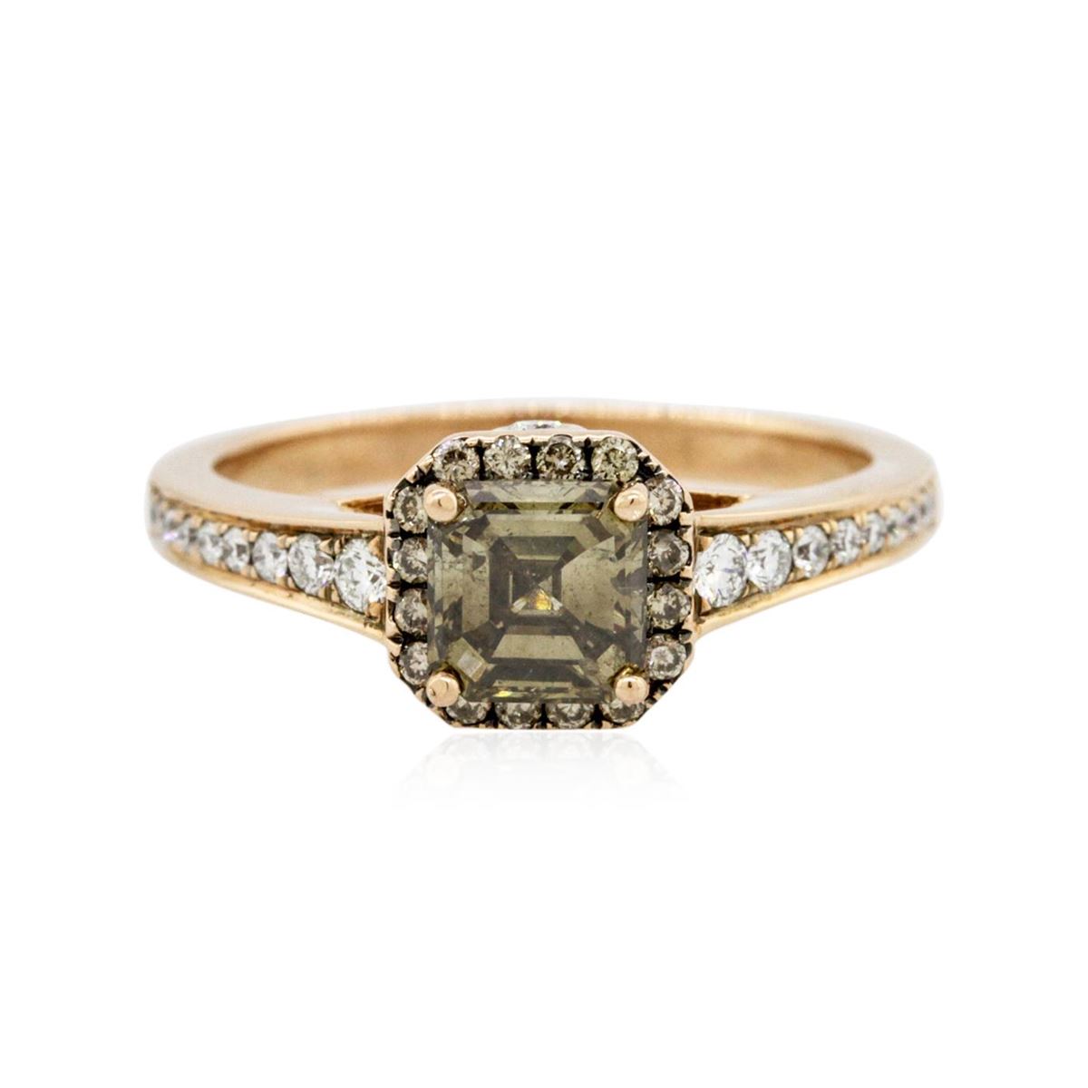 One electronically tested 14KT rose gold ladies cast diamond ring. The featured diamond is set within a diamond bezel supported by diamond set shoulders, completed by a two millimeter wide band. Bright and anodized finish. Identified with markings of "14K". Condition is good. Containing: One prong set square emerald cut diamond, measuring 5.55 x 5.50 x 3.20mm (depth est.), 6.00.%. GTCF approximate weight of 1.02ct. Graded in the setting. Clarity: I-1. Depth: 58.2%. Table 80.0%. Sixteen prong set round brilliant cut diamonds, measuring 1.20 - 1.10 x 0.69mm (depth est.) approximate total weight of 16 Stones = 0.15ct. Color grade is an average for the group. Graded in the setting. Clarity: SI-1 to I-1 Twenty prong and bezel set round brilliant cut diamonds, measuring 1.60 - 1.10 x 0.81mm (depth est.) approximate total weight of 20 Stones = 0.28ct. Graded in the setting. Clarity: SI-1 to SI-2. Color: G - I. Total Weight of Diamonds 1.45ct. Total Weight of Ring 3.38 grams. AIG Appraised at $8,545.00.
