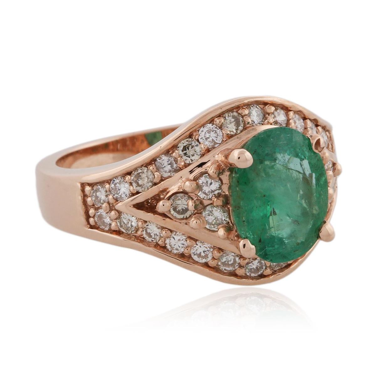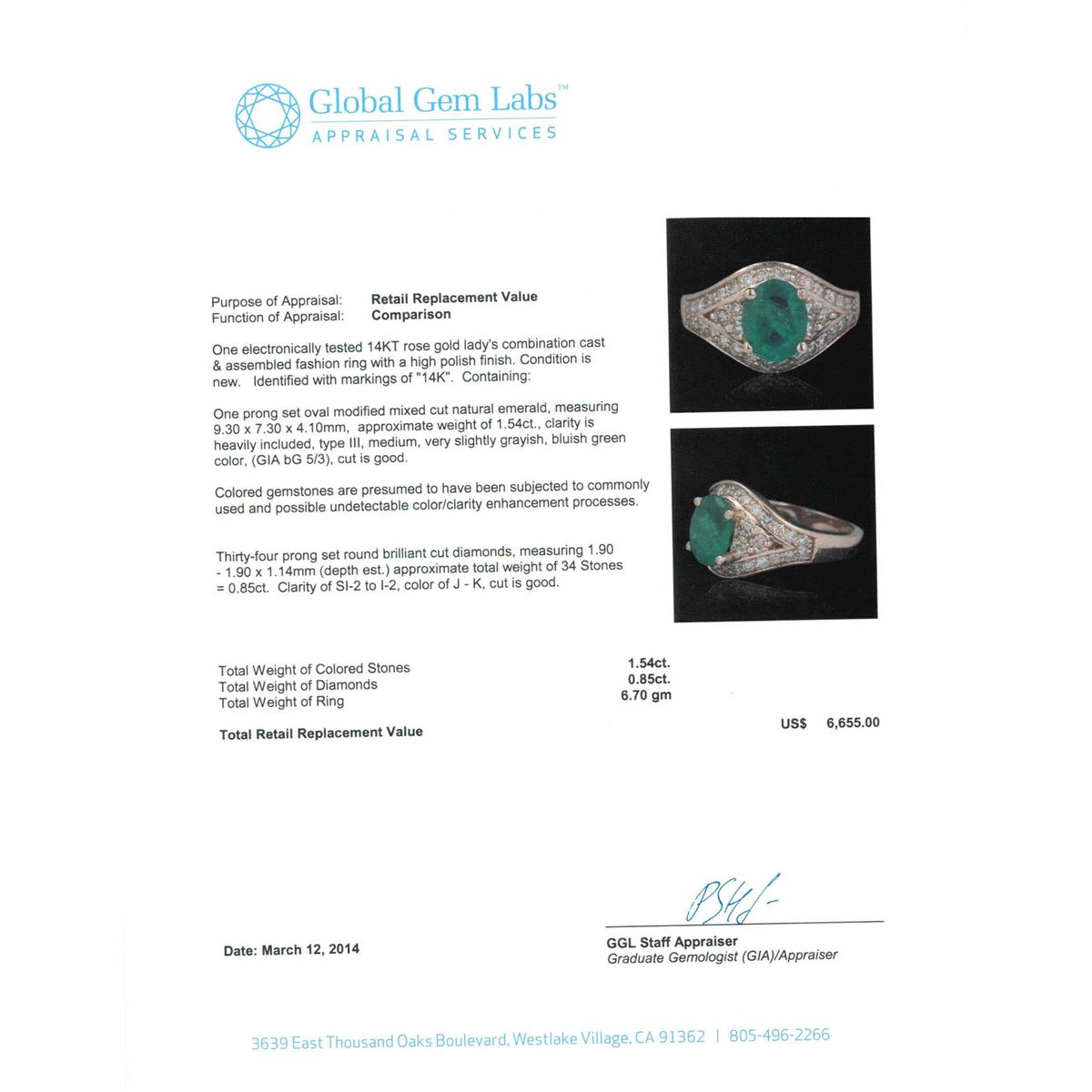One electronically tested 14KT rose gold Ladies combination cast & assembled fashion ring with a high polish finish. Condition is new. Identified with markings of "14K". Containing: One prong set oval modified mixed cut natural emerald, measuring 9.30 x 7.30 x 4.10mm, approximate weight of 1.54ct., clarity is heavily included, type III, medium, very slightly grayish, bluish green color, (GIA bG 5/3), cut is good. Colored gemstones are presumed to have been subjected to commonly used and possible undetectable color/clarity enhancement processes. Thirty-Four prong set round brilliant cut diamonds, measuring 1.90 - 1.90 x 1.14mm (depth est.) approximate total weight of 34 Stones = 0.85ct. Clarity of SI-2 to I-2, Color of J - K, Cut is Good. Total Weight of Colored Stones 1.54ct. Total Weight of Diamonds 0.85ct. Total Weight of Ring 6.70 grams. GGL Appraised at $6,655.00.