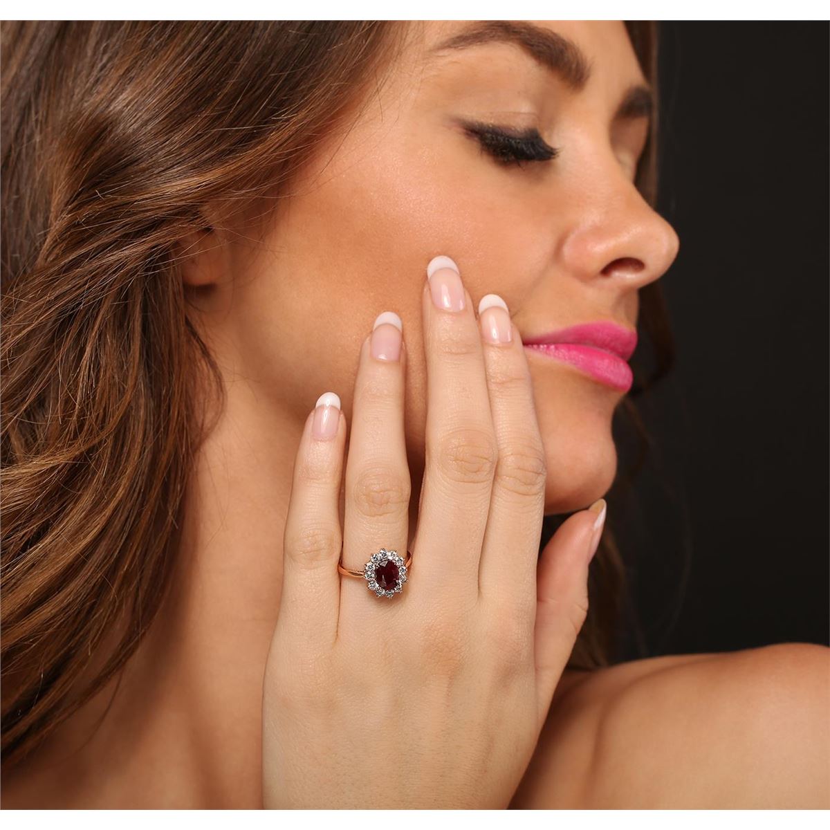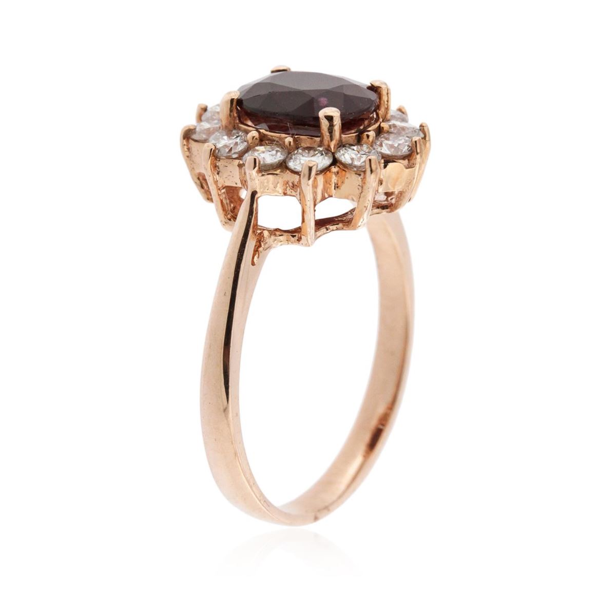 14KT rose gold 1.57ct Ruby and Diamond Ring A6692. One electronically tested 14KT rose gold ladies cast ruby and diamond ring with a bright polish finish. The featured ruby is set within a diamond bezel, completed by a two millimeter wide band. Identified with markings of "K14". Condition is new, good workmanship. Containing: One prong set oval mixed cut natural ruby, measuring 8.00 x 6.00 x 3.35mm, 10%. bulge factor, approximate weight of 1.57ct., clarity is heavily included, type II, medium dark, very slightly brownish, slightly purplish red color, (GIA slpR 6/3), cut is good. Transmitting light somewhat diffusely, transparent to translucent. Naturally occurring internal & external characteristics are present. Indications of laboratory high temperature heat treatment, with glass & flux additives. Graded in the setting. Ruby has a low tolerance to rhodium plating, repolishing the surface, & ultrasonic cleaning.Twelve prong set round brilliant cut diamonds, measuring 2.50 - 2.50 x 1.50mm (depth est.) approximate. Total Weight of 12 Stones = 0.66ct. Graded in the setting. Clarity: I-1 to I-2. Color: F - H. Total Weight of Colored Stones 1.57ct. Total Weight of Diamonds 0.66ct. AIG Appraised at $2,600.00.