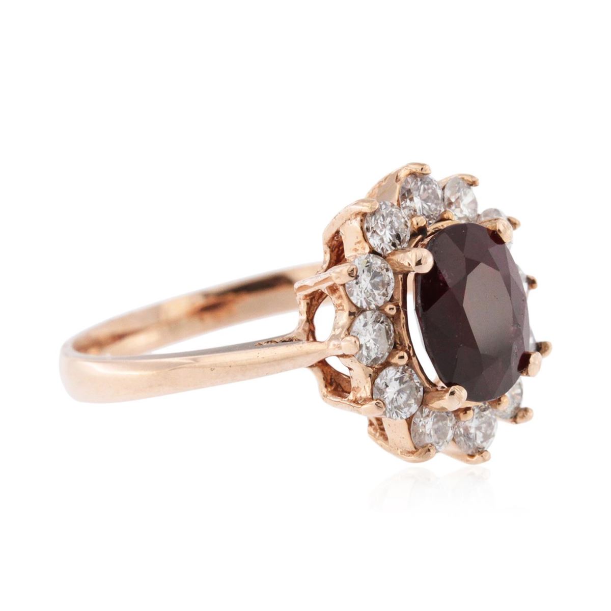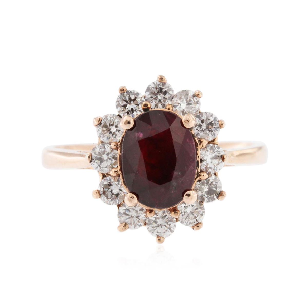 14KT rose gold 1.57ct Ruby and Diamond Ring A6692. One electronically tested 14KT rose gold ladies cast ruby and diamond ring with a bright polish finish. The featured ruby is set within a diamond bezel, completed by a two millimeter wide band. Identified with markings of "K14". Condition is new, good workmanship. Containing: One prong set oval mixed cut natural ruby, measuring 8.00 x 6.00 x 3.35mm, 10%. bulge factor, approximate weight of 1.57ct., clarity is heavily included, type II, medium dark, very slightly brownish, slightly purplish red color, (GIA slpR 6/3), cut is good. Transmitting light somewhat diffusely, transparent to translucent. Naturally occurring internal & external characteristics are present. Indications of laboratory high temperature heat treatment, with glass & flux additives. Graded in the setting. Ruby has a low tolerance to rhodium plating, repolishing the surface, & ultrasonic cleaning.Twelve prong set round brilliant cut diamonds, measuring 2.50 - 2.50 x 1.50mm (depth est.) approximate. Total Weight of 12 Stones = 0.66ct. Graded in the setting. Clarity: I-1 to I-2. Color: F - H. Total Weight of Colored Stones 1.57ct. Total Weight of Diamonds 0.66ct. AIG Appraised at $2,600.00.