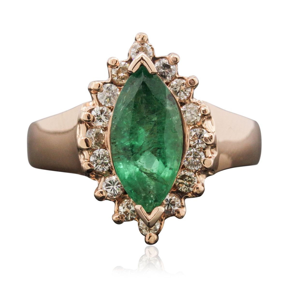 One ring featuring: 14KT rose gold with a total weight of 7.12 grams, emerald with a total weight of 1.59ct, and diamonds with a total weight of 0.43ctw.