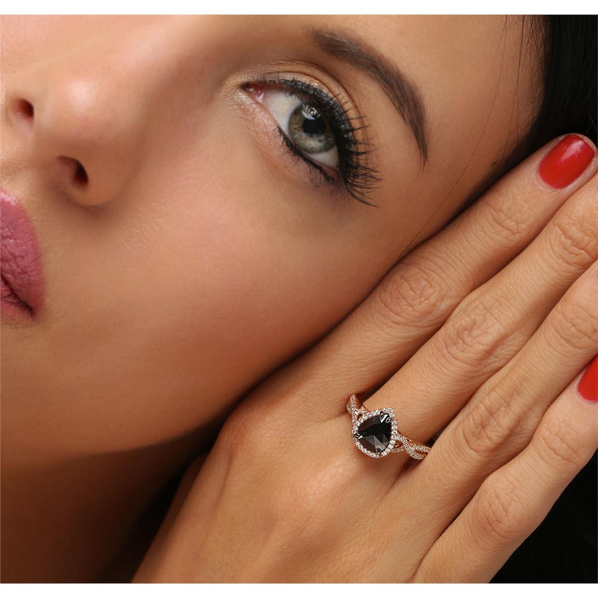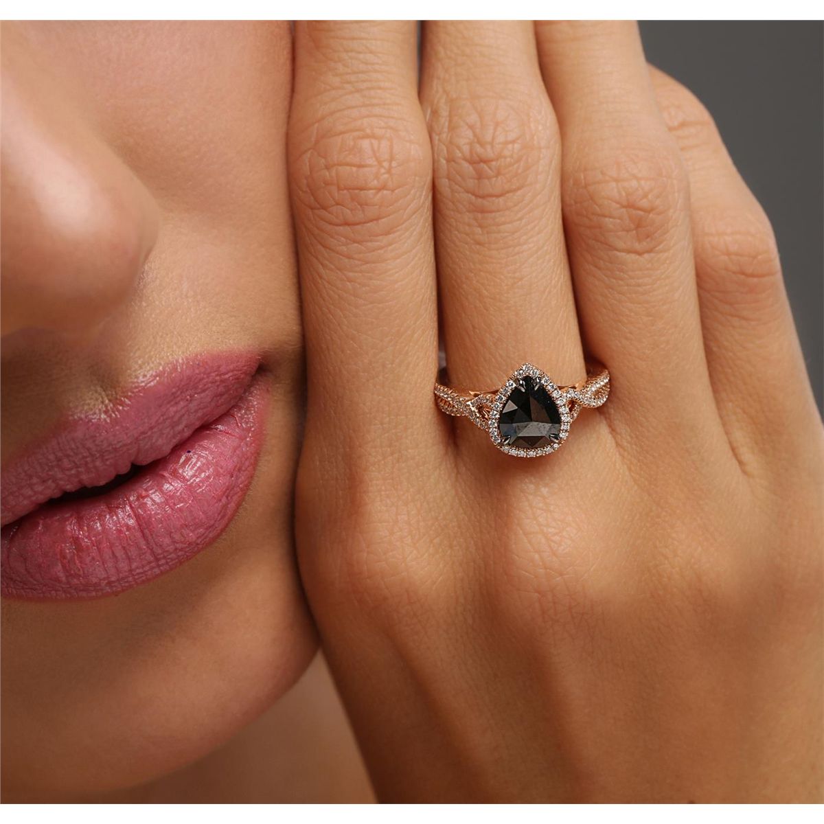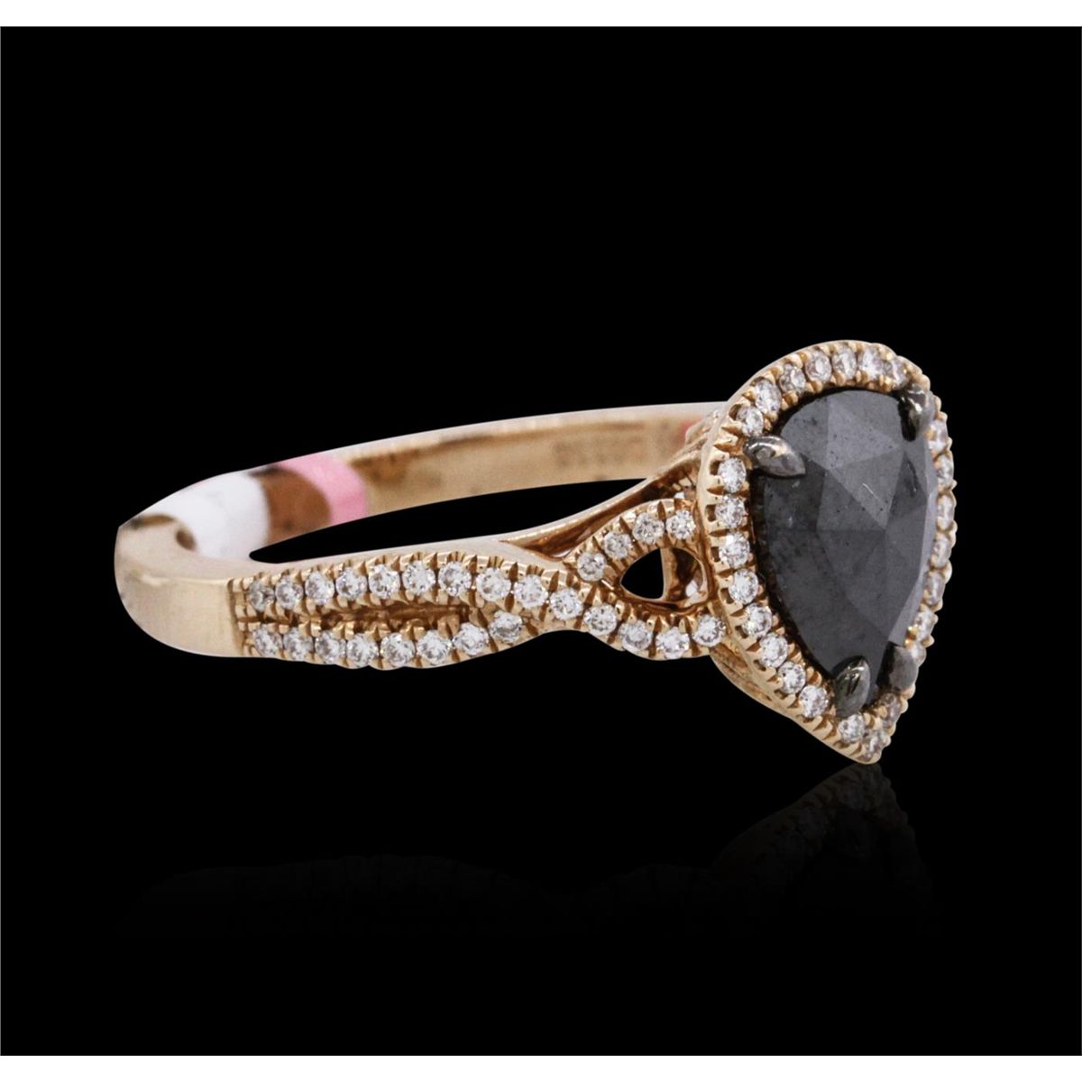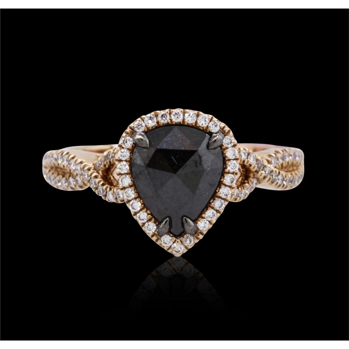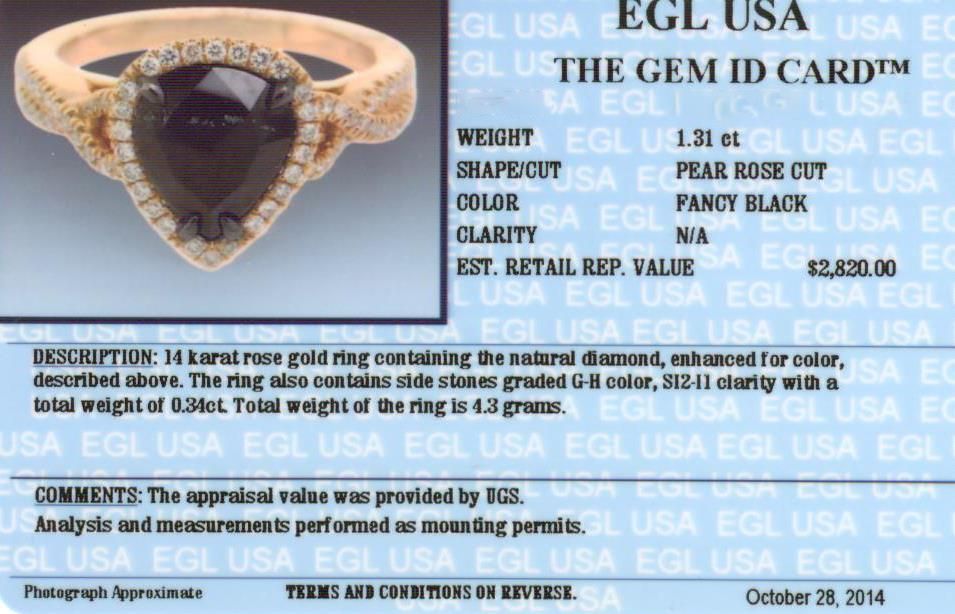 One 14KT rose gold ring containing one natural pear rose cut fancy black diamond, enhanced for color, with a total weight of 1.31ct. The ring also contains side stones graded G-H color, SI2-I1 clarity with a total weight of 0.34ct. Total weight of the ring is 4.30 grams. EGL Appraised at $2,820.00.