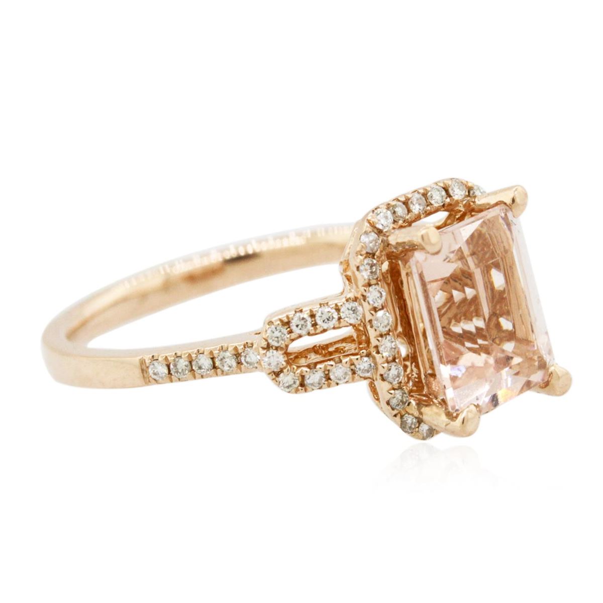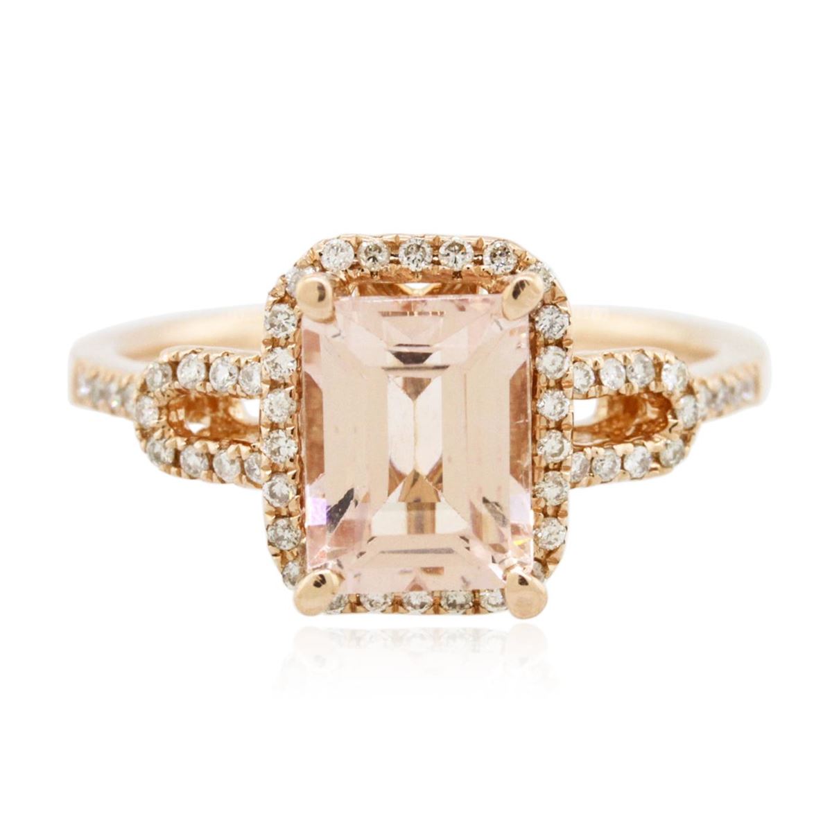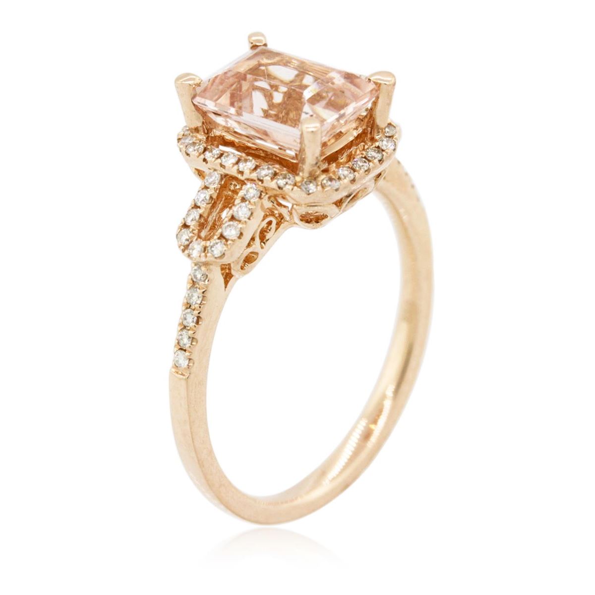 One electronically tested 14KT rose gold Ladies combination cast & assembled ring with a bright polish finish. Condition is new. Identified with markings of "14K". Containing: One prong set emerald standard step cut natural morganite, measuring 8.00 x 6.10 x 4.62mm, approximate. Total Weight of 1.66ct., clarity is eye clean, type I, light, brownish, reddish orange color, (GIA rO 3/1), cut is good. Fifty-Four prong set round brilliant cut diamonds, measuring 1.10 - 1.10 x 0.66mm (depth est.) approximate. Total Weight of 54 Stones = 0.26ct. Clarity: I-1 to I-2. Color: I - J, Cut is Good. Colored gemstones are presumed to have been subjected to commonly used enhancement processes. All diamonds and colored gemstones are graded in the mounting, unless otherwise stated. Total Weight of Colored Stones 1.66ct. Total Weight of Diamonds 0.26ct. Total Weight of Ring 3.40 grams. GGL Appraised at $3,035.00.