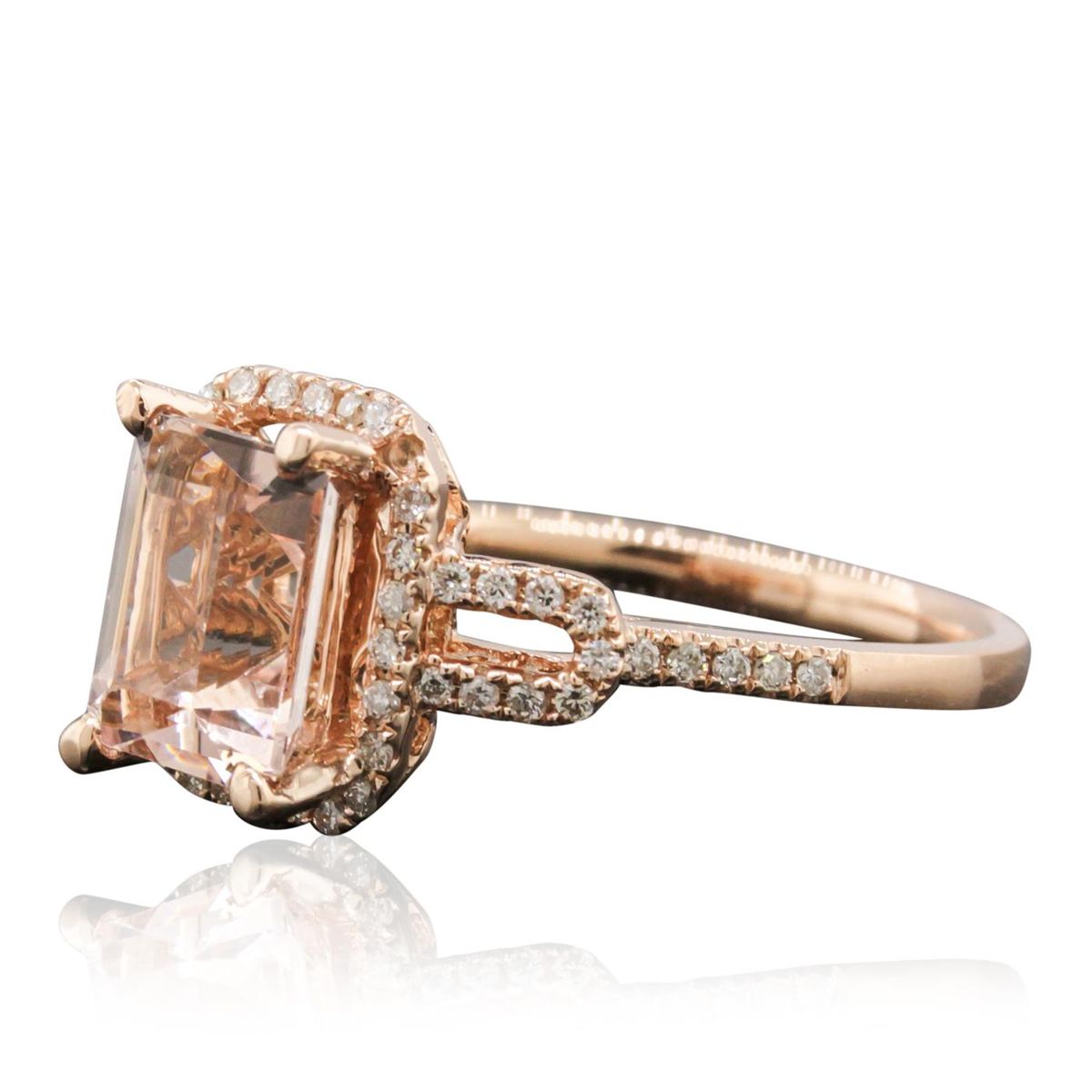 One electronically tested 14KT rose gold Ladies combination cast & assembled ring with a bright polish finish. Condition is new. Identified with markings of "14K". Containing: One prong set emerald standard step cut natural morganite, measuring 8.00 x 6.10 x 4.62mm, approximate. Total Weight of 1.66ct., clarity is eye clean, type I, light, brownish, reddish orange color, (GIA rO 3/1), cut is good. Fifty-Four prong set round brilliant cut diamonds, measuring 1.10 - 1.10 x 0.66mm (depth est.) approximate. Total Weight of 54 Stones = 0.26ct. Clarity: I-1 to I-2. Color: I - J, Cut is Good. Colored gemstones are presumed to have been subjected to commonly used enhancement processes. All diamonds and colored gemstones are graded in the mounting, unless otherwise stated. Total Weight of Colored Stones 1.66ct. Total Weight of Diamonds 0.26ct. Total Weight of Ring 3.40 grams. GGL Appraised at $3,035.00.