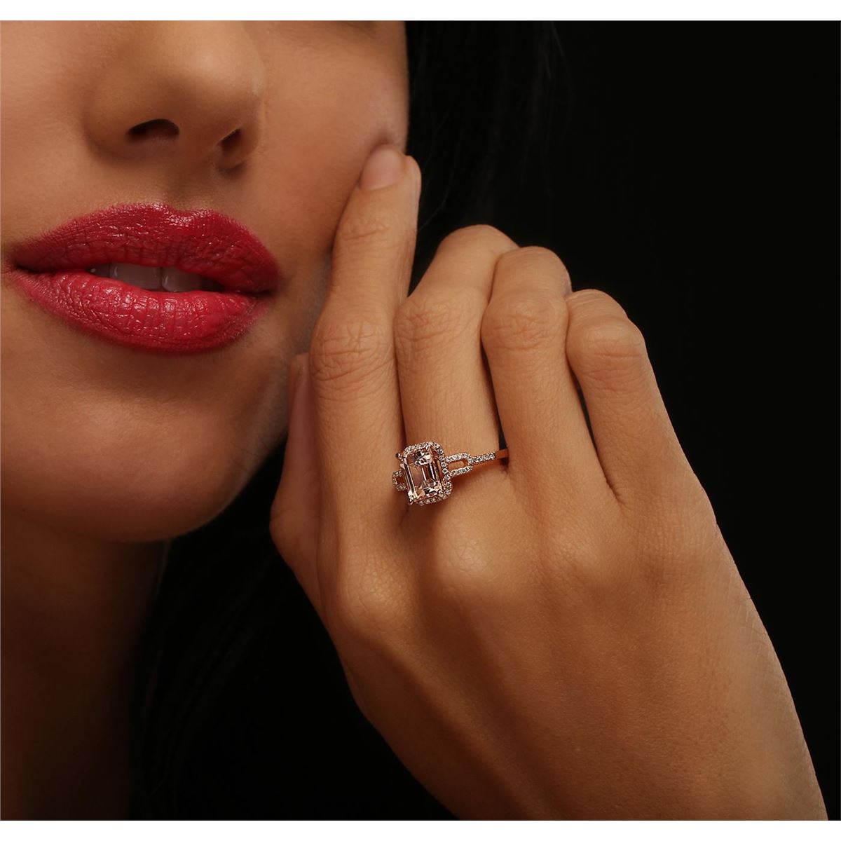 One electronically tested 14KT rose gold Ladies combination cast & assembled ring with a bright polish finish. Condition is new. Identified with markings of "14K". Containing: One prong set emerald standard step cut natural morganite, measuring 8.00 x 6.10 x 4.62mm, approximate. Total Weight of 1.66ct., clarity is eye clean, type I, light, brownish, reddish orange color, (GIA rO 3/1), cut is good. Fifty-Four prong set round brilliant cut diamonds, measuring 1.10 - 1.10 x 0.66mm (depth est.) approximate. Total Weight of 54 Stones = 0.26ct. Clarity: I-1 to I-2. Color: I - J, Cut is Good. Colored gemstones are presumed to have been subjected to commonly used enhancement processes. All diamonds and colored gemstones are graded in the mounting, unless otherwise stated. Total Weight of Colored Stones 1.66ct. Total Weight of Diamonds 0.26ct. Total Weight of Ring 3.40 grams. GGL Appraised at $3,035.00.