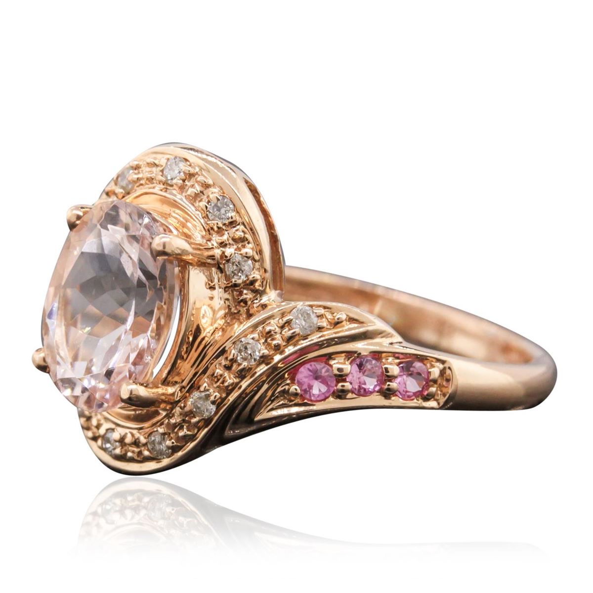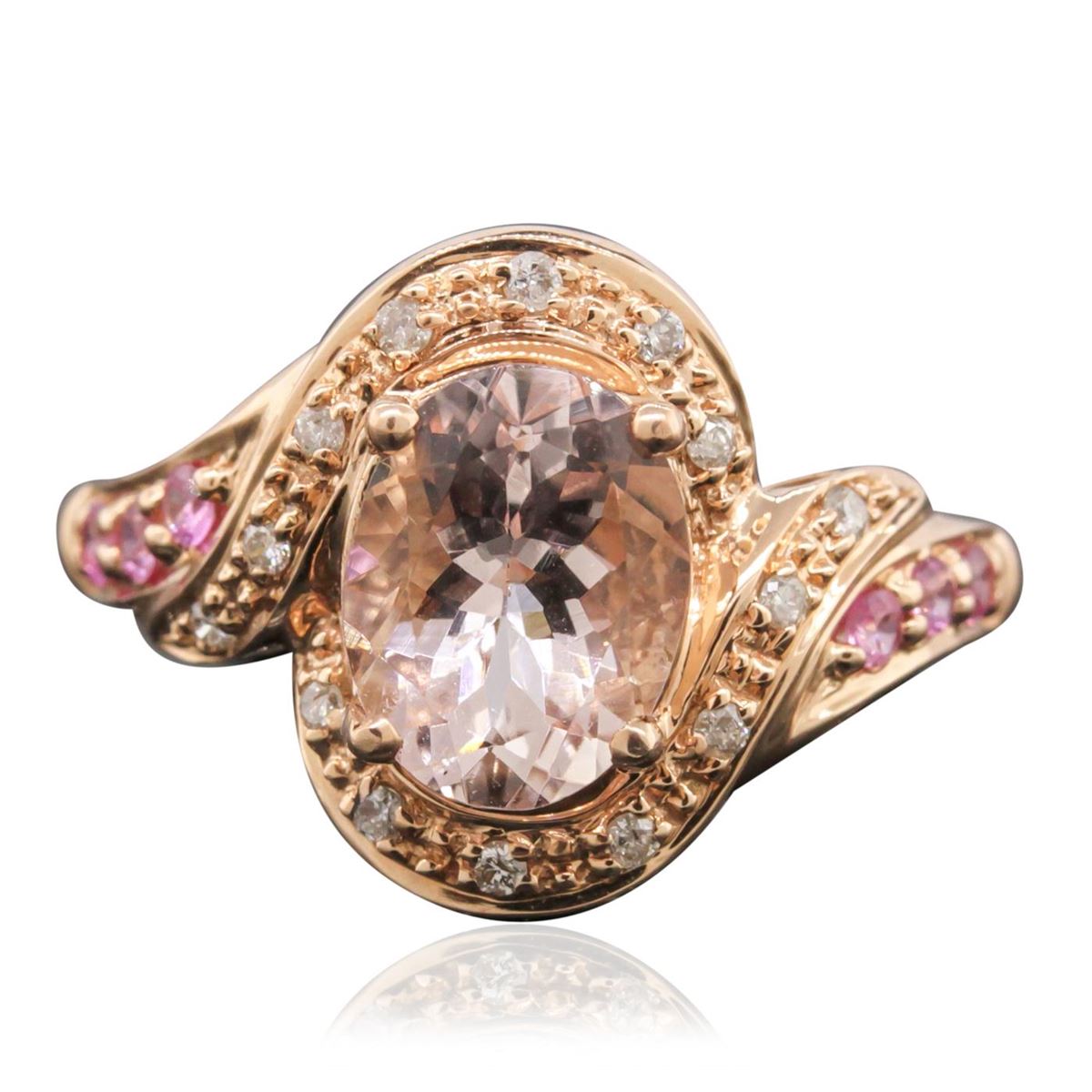 One ring featuring: 14KT rose gold with a total weight of 2.93 grams, (1) morganite with a total weight of 1.68ct, and (6) pink sapphires with a total weight of 0.14ctw, and (14) diamonds.