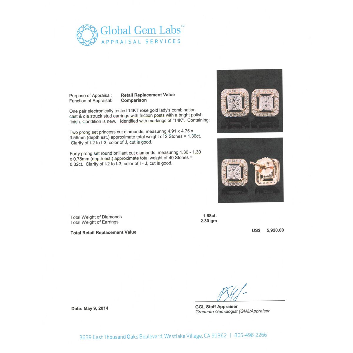 One pair electronically tested 14KT rose gold Ladies combination cast & die struck stud earrings with friction posts with a bright polish finish. Condition is new. Identified with markings of "14K". Containing: Two prong set princess cut diamonds, measuring 4.91 x 4.75 x 3.56mm (depth est.) approximate. Total Weight of 2 Stones = 1.36ct. Clarity: I-2 to I-3. Color: J, Cut is Good. Forty prong set round brilliant cut diamonds, measuring 1.30 - 1.30 x 0.78mm (depth est.) approximate. Total Weight of 40 Stones = 0.32ct. Clarity: I-2 to I-3. Color: I - J, Cut is Good. Total Weight of Diamonds 1.68ct. Total Weight of Earrings 2.30 grams. GGL Appraised at $5,920.00.