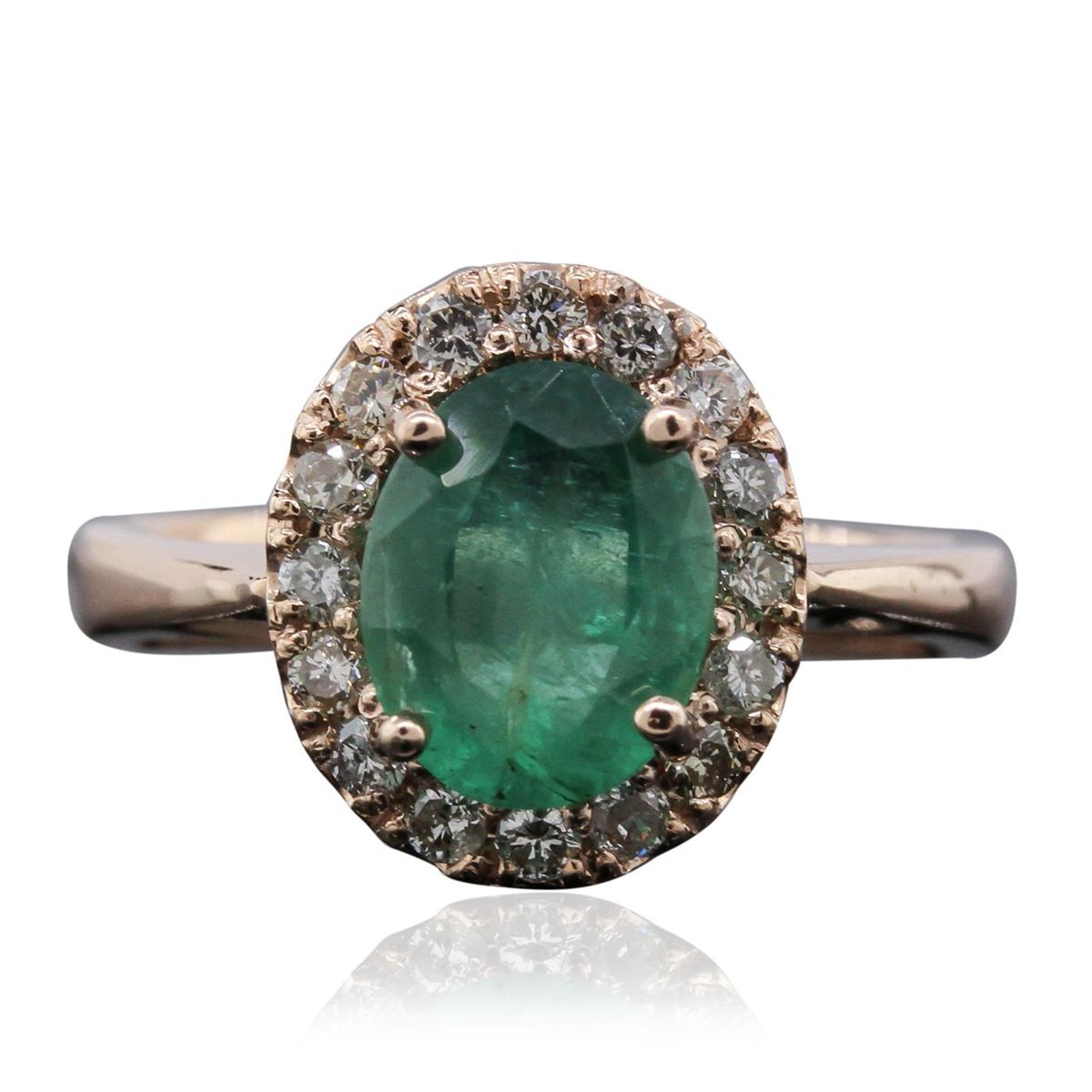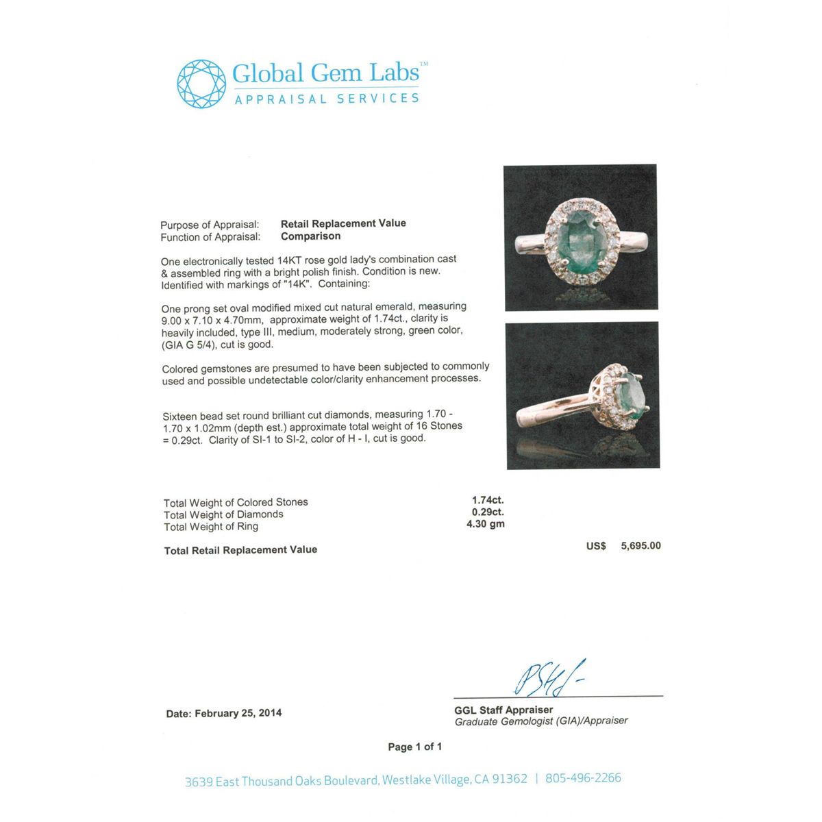 Great Condition! One electronically tested 14KT rose gold Ladies combination cast & assembled ring with a bright polish finish. Condition is new. Identified with markings of "14K". Containing: One prong set oval modified mixed cut natural emerald, measuring 9.00 x 7.10 x 4.70mm, approximate weight of 1.74ct., clarity is heavily included, type III, medium, moderately strong, green color, (GIA G 5/4), cut is good. Colored gemstones are presumed to have been subjected to commonly used and possible undetectable color/clarity enhancement processes. Sixteen bead set round brilliant cut diamonds, measuring 1.70 - 1.70 x 1.02mm (depth est.) approximate total weight of 16 Stones = 0.29ct. Clarity of SI-1 to SI-2, Color of H - I, Cut is Good. Total Weight of Colored Stones 1.74ct. Total Weight of Diamonds 0.29ct. Total Weight of Ring 4.30 grams. GGL Appraised at $5,695.00.