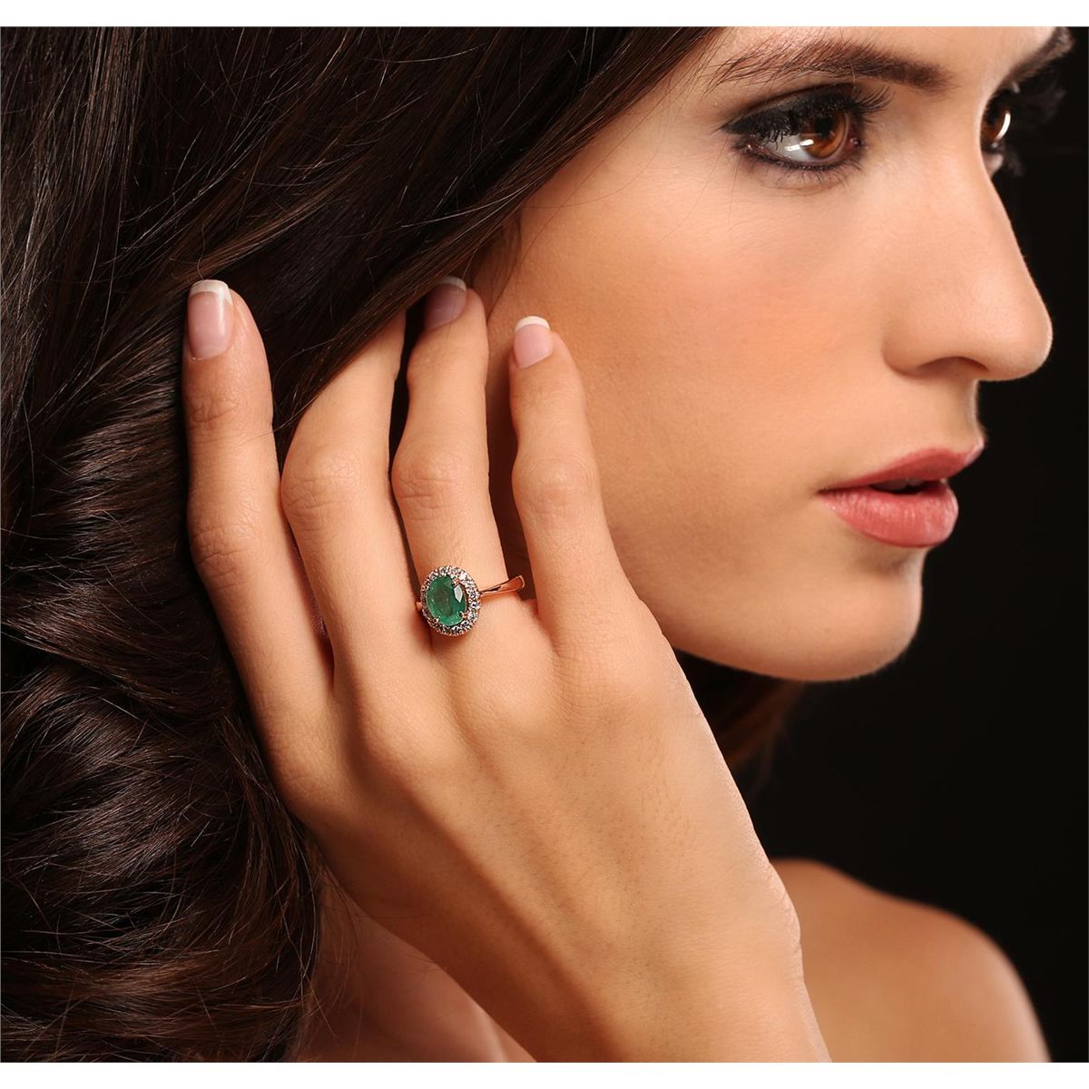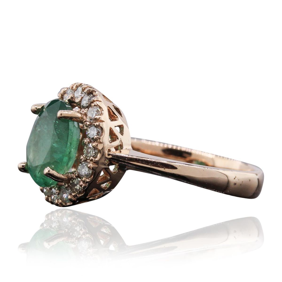 Great Condition! One electronically tested 14KT rose gold Ladies combination cast & assembled ring with a bright polish finish. Condition is new. Identified with markings of "14K". Containing: One prong set oval modified mixed cut natural emerald, measuring 9.00 x 7.10 x 4.70mm, approximate weight of 1.74ct., clarity is heavily included, type III, medium, moderately strong, green color, (GIA G 5/4), cut is good. Colored gemstones are presumed to have been subjected to commonly used and possible undetectable color/clarity enhancement processes. Sixteen bead set round brilliant cut diamonds, measuring 1.70 - 1.70 x 1.02mm (depth est.) approximate total weight of 16 Stones = 0.29ct. Clarity of SI-1 to SI-2, Color of H - I, Cut is Good. Total Weight of Colored Stones 1.74ct. Total Weight of Diamonds 0.29ct. Total Weight of Ring 4.30 grams. GGL Appraised at $5,695.00.
