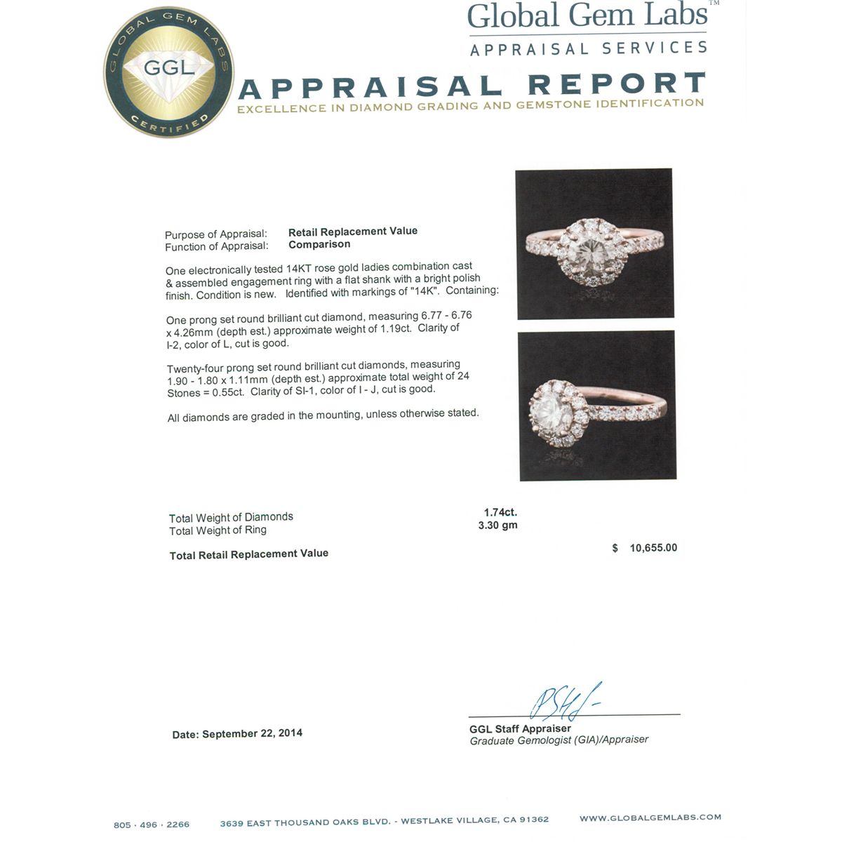 One electronically tested 14KT rose gold ladies combination cast & assembled engagement ring with a flat shank with a bright polish finish. Identified with markings of "14K". Condition is new. Containing: One prong set round brilliant cut diamond, measuring 6.77 - 6.76 x 4.26mm (depth est.) approximate weight of 1.19ct. Clarity: I-2. Color: L, Cut is Good. Twenty-Four prong set round brilliant cut diamonds, measuring 1.90 - 1.80 x 1.11mm (depth est.) approximate total weight of 24 Stones = 0.55ct. Clarity: SI-1. Color: I - J, Cut is Good. All diamonds are graded in the mounting, unless otherwise stated. Total Weight of Diamonds 1.74ct. Total Weight of Ring 3.30 grams. GGL Appraised at $10,655.00.