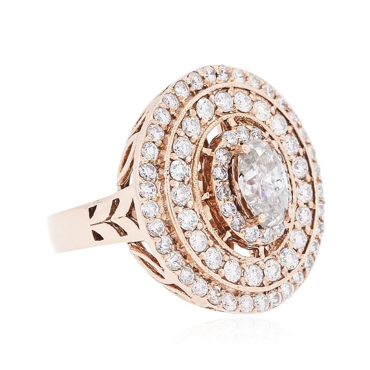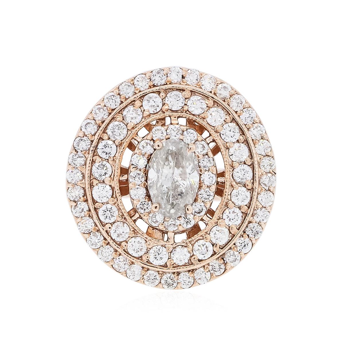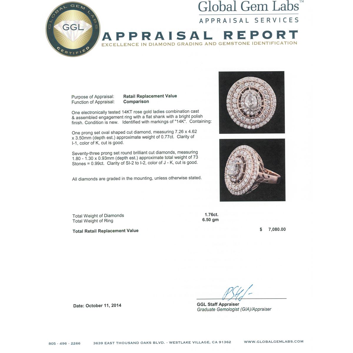 One electronically tested 14KT rose gold ladies combination cast & assembled engagement ring with a flat shank with a bright polish finish. Identified with markings of "14K". Condition is new. Containing: One prong set oval shaped cut diamond, measuring 7.26 x 4.62 x 3.50mm (depth est.) approximate weight of 0.77ct. Clarity: I-1. Color: K, Cut is Good. Seventy-Three prong set round brilliant cut diamonds, measuring 1.80 - 1.30 x 0.93mm (depth est.) approximate total weight of 73 Stones = 0.99ct. Clarity: SI-2 to I-2. Color: J - K, Cut is Good. All diamonds are graded in the mounting, unless otherwise stated. Total Weight of Diamonds 1.76ct. Total Weight of Ring 6.50 grams. GGL Appraised at $7,080.00.