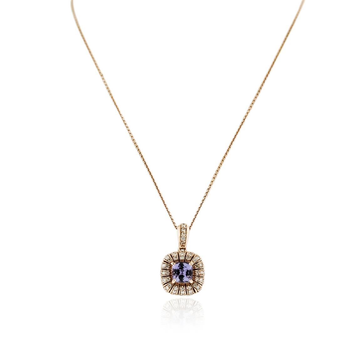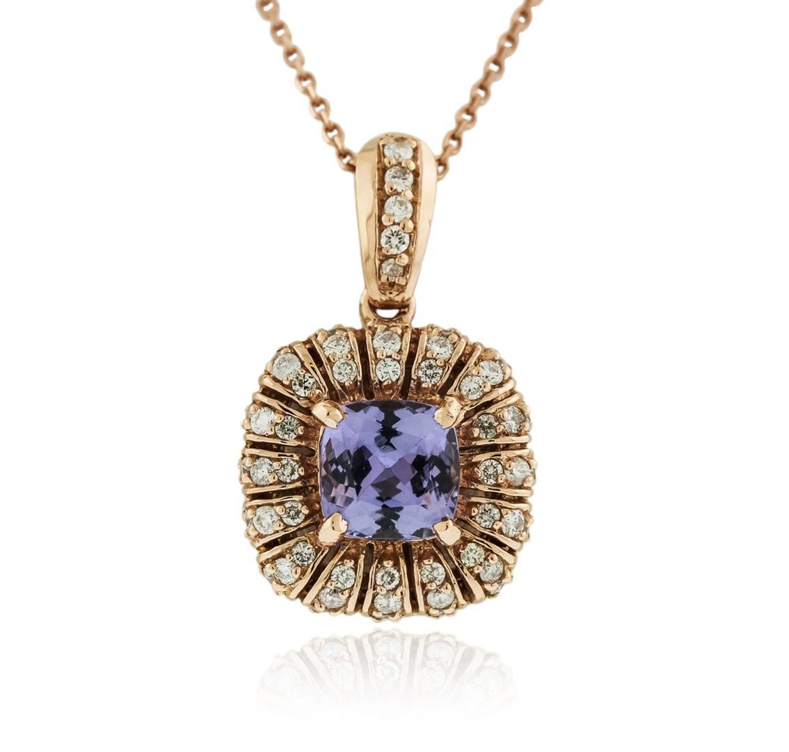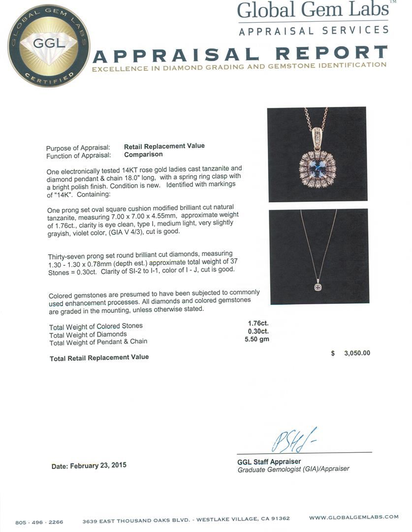 One electronically tested 14KT rose gold ladies cast tanzanite and diamond pendant & chain 18.0" long, with a spring ring clasp with a bright polish finish. Identified with markings of "14K". Condition is new. Containing: One prong set oval square cushion modified brilliant cut natural tanzanite, measuring 7.00 x 7.00 x 4.55mm, approximate weight of 1.76ct., clarity is eye clean, type I, medium light, very slightly grayish, violet color, (GIA V 4/3), cut is good. Thirty-Seven prong set round brilliant cut diamonds, measuring 1.30 - 1.30 x 0.78mm (depth est.) approximate total weight of 37 Stones = 0.30ct. Clarity: SI-2 to I-1. Color: I - J, Cut is Good. Colored gemstones are presumed to have been subjected to commonly used enhancement processes. All diamonds and colored gemstones are graded in the mounting, unless otherwise stated. Total Weight of Colored Stones 1.76ct. Total Weight of Diamonds 0.30ct. Total Weight of Pendant & Chain 5.50 grams. GGL Appraised at $3,050.00.