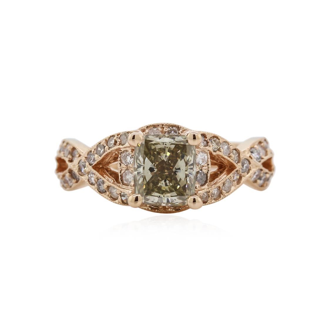 One electronically tested 14KT rose gold ladies cast diamond ring with a bright polish finish. Identified with markings of "14K". Condition is new. Containing: One prong set cushion cut diamond, measuring 6.50 x 5.80 x 4.11mm (depth est.) approximate weight of 1.32ct. Clarity: SI-1, color of Fancy Light Green, Cut is Good. Whether the color of this diamond is of natural origin or an artificial process cannot currently be determined. Forty-Six prong set round brilliant cut diamonds, measuring 1.50 - 1.30 x 0.84mm (depth est.) approximate total weight of 46 Stones = 0.46ct. Clarity: I-1 to I-2. Color: J - K. All diamonds are graded in the mounting, unless otherwise stated. Total Weight of Diamonds 1.78ct. Total Weight of Ring 4.30 grams. GGL Appraised at $5,995.00.